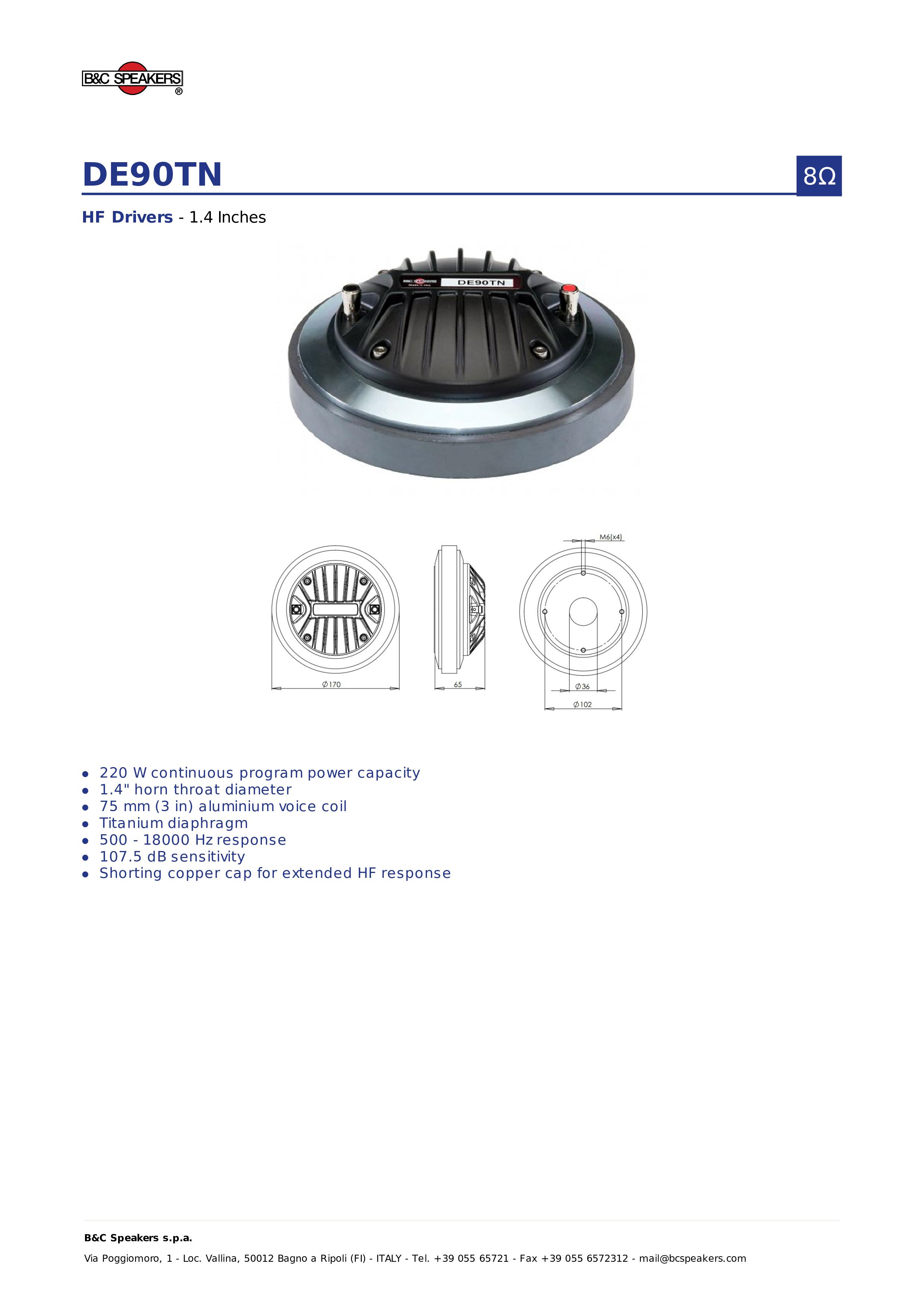 Loa Treble B&C SPEAKERS DE90TN Thương hiệu: B&C Xuất xứ: ITALIA Sử dụng họng 1.4" (ME90) Voice coil aluminium 75mm (3") Công Suất Program 220 W Độ nhạy: 107,5 db Dải tần: 500 - 18000 hz Titanium diaphragm. Khối lượng: 4,5 kg Kích thước: 170 x 65 mm