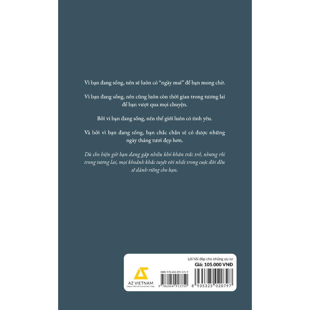 Sách - Lời Hồi Đáp Cho Những Ưu Tư Trong tương lai, những muộn phiền vẫn sẽ liên tục xuất hiện. Dù bạn cố gắng xử lý vấn đề tốt ra sao và đã gỡ rối được việc gì đó một cách hợp lý đến nhường nào, thì chỉ cần thời gian trôi qua, những mối lo mới vẫn sẽ tiếp tục tìm đến. Giả sử bạn đang phải đối mặt với một nỗi lo lắng không ngừng giày vò mình, thứ bạn cần có ngay lúc này là tinh thần bình tĩnh và sáng suốt để giải quyết vấn đề. Tâm trí bất an thì bạn sẽ không thể làm được gì bởi bản thân còn mải lo lắng. Bạn cần một tinh thần vững vàng để đi tìm cách xử lý rắc rối. Cuốn sách “Lời hồi đáp cho những ưu tư” không chỉ chứa đựng những phương pháp để có được một tinh thần bình thản mà còn có cả câu chuyện của những con người đã từng vượt qua nhiều vấn đề khó giải quyết. Nếu bạn còn nhiều băn khoăn trong lòng, tôi mong rằng cuốn sách này sẽ cho bạn lời giải. Vì bạn đang sống, nên sẽ luôn có “ngày mai” để bạn mong chờ. Vì bạn đang sống, nên luôn còn thời gian để vượt qua mọi chuyện. Và vì bạn đang sống, chắc chắn bạn sẽ có ngày tháng tươi đẹp hơn. Dù hiện giờ còn nhiều khó khăn trắc trở, nhưng rồi trong tương lai, mọi khoảnh khắc tuyệt vời nhất trong cuộc đời đều sẽ dành riêng cho bạn