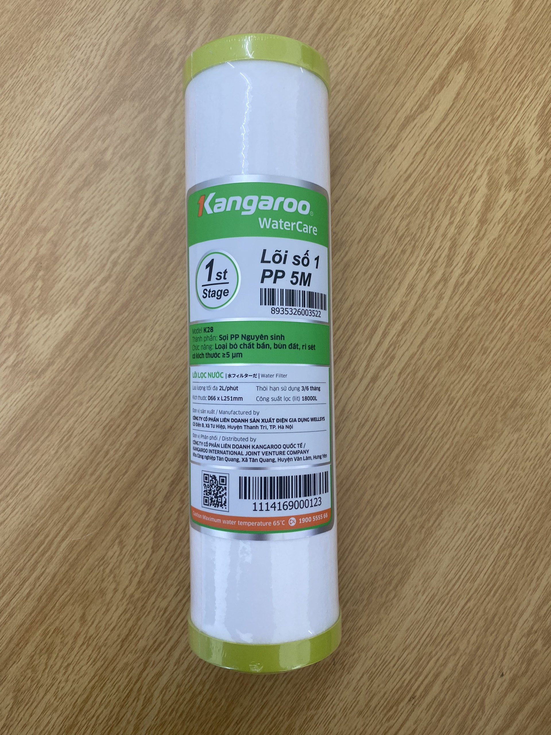 Mua tại Tiktok- Lõi Số 1 - 10'' PP - 5 micro Kangaroo K28 Nguyên liệu: Sợi PP có khe lọc 5 micron.