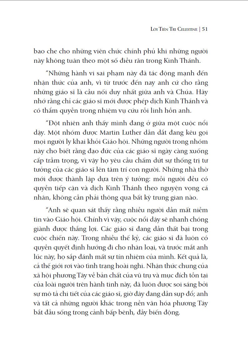 Không hàn lâm, khó hiểu như những quyển sách cùng chủ đề, bằng ngôn ngữ bình dị, “Lời tiên tri Celestine” đã truyền tải thông điệp về mặt tâm linh một cách mới mẻ dưới dạng tiểu thuyết, lôi cuốn người đọc từ đầu đến cuối.