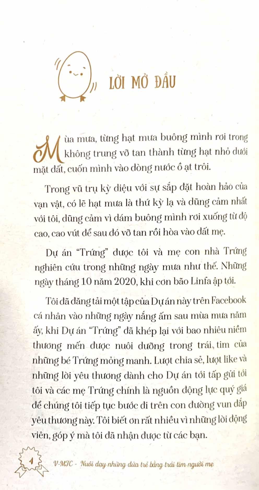 Lớp Trứng Vịt (4 – 5 tuổi) là một trong 6 cuốn sách thuộc Dự án “Trứng” – Mô hình V – MTC, dạy học dự trên Dự án theo hướng Chú trọng Quá trình. V-MTC = Vân – Mẹ trẻ con = Vietnamese – Mother Of Child (Việt Nam – Mẹ của trẻ con), là phương pháp nuôi dạy những đứa trẻ của những “người mẹ Việt”. V-MTC vẫn đang lớn lên mỗi ngày. Mỗi bước chân trong hành trình là những bài học lớn với dự án.