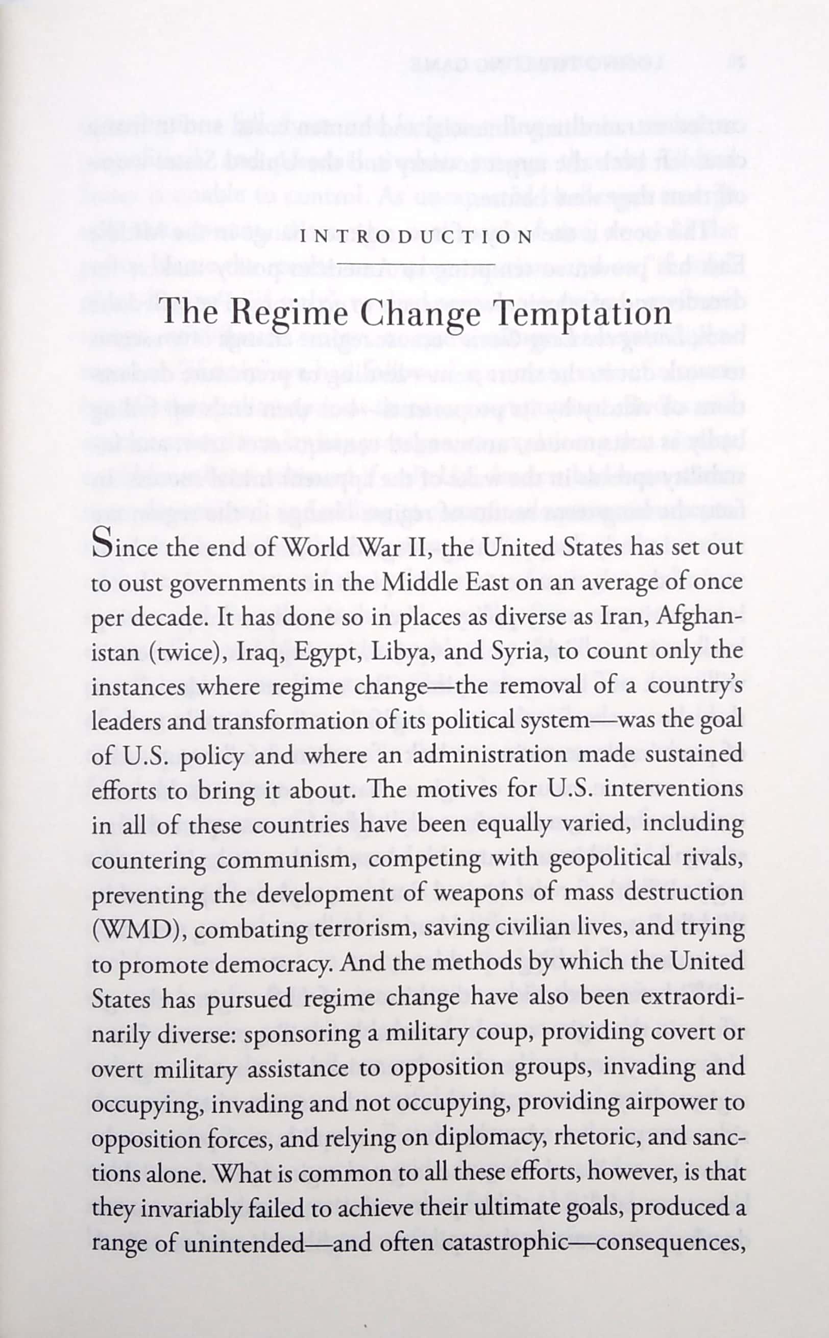 Since the end of World War II, the United States has set out to oust governments in the Middle East on an average of around once per decade. It has done so in places as diverse as Iran, Iraq, Afghanistan (twice), Egypt, Libya, and Syria - to count only the instances where regime change was effectively U.S. policy and where Washington led the effort. The reasons for these interventions have also been extremely diverse, including countering communism, geopolitical competition, preventing the development of weapons of mass destruction, combatting terrorism, saving civilian lives, and promoting democracy. And the methods by which the United States pursued regime change have also been highly varied: sponsoring a military coup, providing covert or overt military assistance to opposition groups, invading and occupying, invading and not occupying, providing air power to opposition forces, or relying on diplomacy, rhetoric, and sanctions. What is common to all the operations, however, is that they failed to achieve their ultimate goals, produced a range of unintended and even catastrophic consequences, carried heavy financial and human costs, and in many cases left the countries in question worse off than they were before.