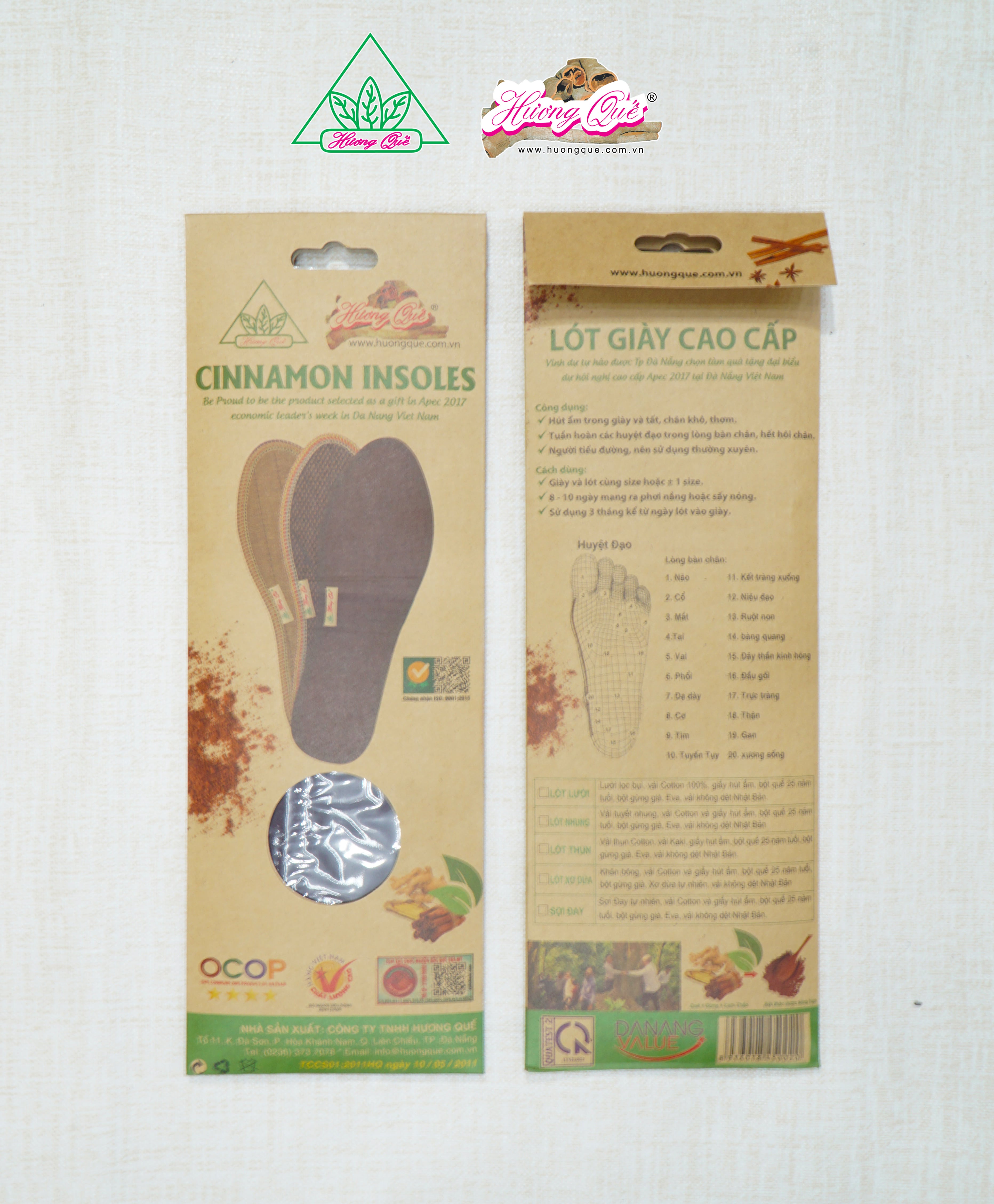 - Lót giày vải Hương Quế có thành phần từ cây Quế Trà My - Quảng Nam (là một trong bốn thảo dược quý Sâm - Nhung - Quế - Phụ) có chất lượng