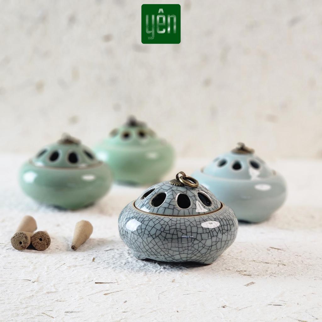 Lư xông nụ trầm hương bằng gốm sứ men cổ cao cấp, nắp đồng hoa văn cổ điển, dùng đốt nụ trầm, nụ thảo mộc, trầm viên, đá thơm, lá xông. Thiết kế nhỏ gọn, tinh tế, thích hợp cho không gian thiền, phòng ngủ, bàn trà, bàn thờ.