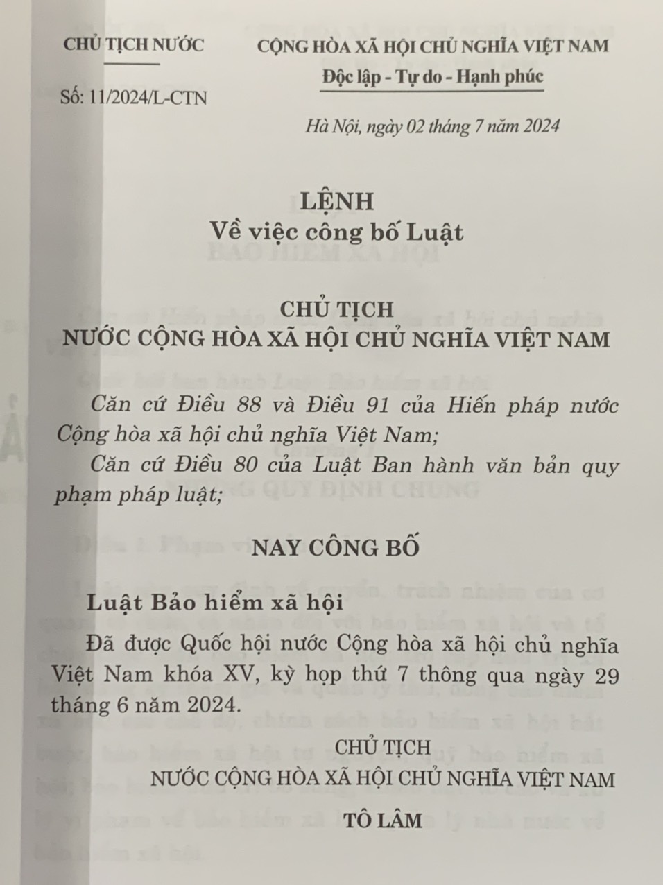 Luật Bảo hiểm xã hội năm 2024 NXB: Chính trị Quốc gia Sự thật Tác giả: Quốc Hội Ngày xuất bản: 7.2024 Khổ sách:13*19cm Công ty phát hành: NXB Chính trị Quốc gia Sự thật Hình thức bìa: Bìa mềm Giá bìa: 42.000 đ Lời giới thiệu: Luật Bảo hiểm xã hội đã được Quốc hội nước Cộng hòa xã hội chủ nghĩa Việt Nam khóa XV , kỳ họp thứ 7, thông qua ngày 29 tháng 6 năm 2024.