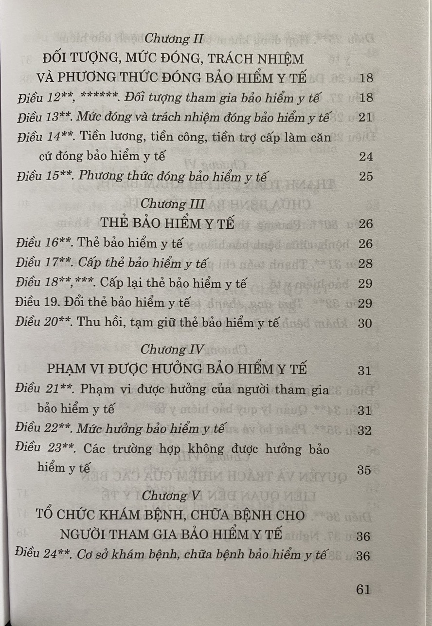 Luật Bảo hiểm y tế năm 2008 đã được Quốc hội nước Cộng hòa xã hội chủ nghĩa Việt Nam khóa XII, kỳ họp thứ 4 thông qua ngày 14/11/2008, quy định về chế độ, chính sách bảo hiểm y tế, bao gồm đối tượng, mức đóng, trách nhiệm và phương thức đóng bảo hiểm y tế; thẻ bảo hiểm y tế; phạm vi được hưởng bảo hiểm y tế; tổ chức khám bệnh, chữa bệnh cho người tham gia bảo hiểm y tế; thanh toán chi phí khám bệnh, chữa bệnh bảo hiểm y tế; quỹ bảo hiểm y tế; quyền và trách nhiệm của các bên liên quan đến bảo hiểm y tế.