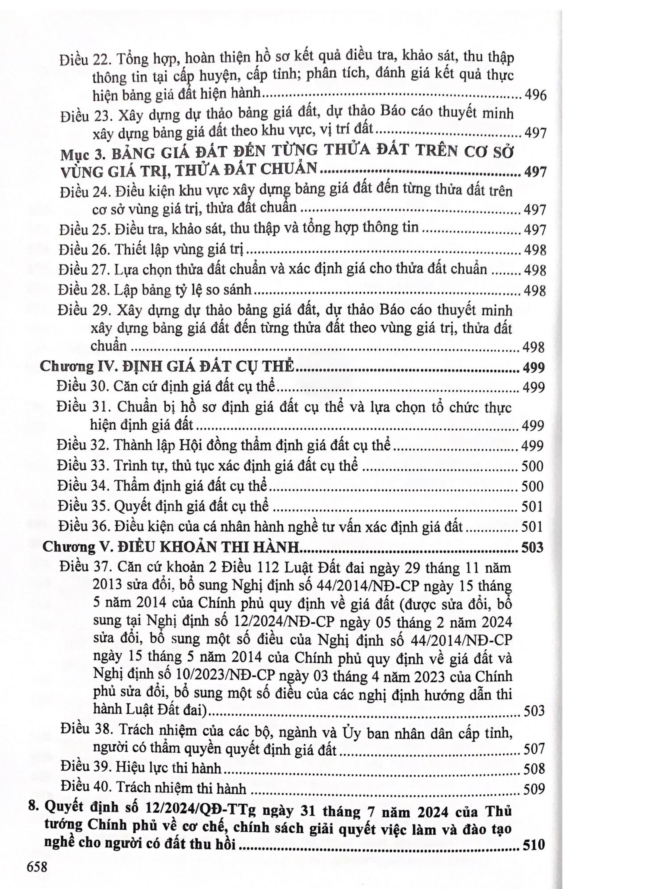 Ngày 18 tháng 01 năm 2024, Quốc hội nước Cộng hòa xã hội chủ nghĩa Việt Nam khóa XV, kỳ họp bất thường lần thứ năm đã chính thức thông qua Luật Đất đai (sau đây gọi tắt là Luật Đất đai 2024) với nhiều điểm mới nhằm thể chế hóa toàn diện các chủ trương, chính sách của Đảng và Nhà nước. Nhằm sớm đưa Luật đất đai 2024 Chính phủ và các Bộ ngành đã ban hành nhiều văn bản quy định chi tiết thi hành như: Nghị định số 104/2024/NĐ-CP ngày 31 tháng 7 năm 2024 của Chính phủ quy định về Quỹ phát triển đất; Nghị định số 103/2024/NĐ-CP ngày 30 tháng 7 năm 2024 của Chính phủ Quy định về tiền sử dụng đất, tiền thuê đất; Nghị định số 102/2024/NĐ-CP ngày 30 tháng 7 năm 2024 của Chính phủ Quy định chi tiết thi hành một số điều của Luật Đất đai 2024; Nghị định số 101/2024/NĐ-CP ngày 29 tháng 7 năm 2024 của Chính phủ Quy định về điều tra cơ bản đất đai; đăng ký, cấp giấy chứng nhận quyền sử dụng đất, quyền sở hữu tài sản gắn liền với đất và hệ thống thông tin đất đai; Nghị định số 88/2024/NĐ-CP ngày 15 tháng 7 năm 2024 của Chính phủ Quy định về bồi thường, hỗ trợ, tái định cư khi Nhà nước thu hồi đất; Thông tư số 08/2024/TT-BTNMT ngày 31 tháng 7 năm 2024 của Bộ Tài nguyên và Môi trường Quy định về thống kê, kiểm kê đất đai và lập bản đồ hiện trạng sử dụng đất; Thông tư số 09/2024/TT-BTNMT ngày 31 tháng 7 năm 2024 của Bộ Tài nguyên và Môi trường Quy định về nội dung, cấu trúc, kiểu thông tin cơ sở dữ liệu quốc gia về đất đai và yêu cầu kỹ thuật đối với phần mềm ứng dụng của Hệ thống thông tin quốc gia về đất đai; Thông tư số 10/2024/TT-BTNMT ngày 31 tháng 7 năm 2024 của Bộ Tài nguyên và Môi trường Quy định về hồ sơ địa chính, Giấy chứng nhận quyền sử dụng đất, quyền sở hữu tài sản gắn liền với đất; Thông tư số 11/2024/TT-BTNMT ngày 31 tháng 7 năm 2024 của Bộ Tài nguyên và Môi trường Quy định kỹ thuật điều tra, đánh giá đất đai; kỹ thuật bảo vệ, cải tạo, phục hồi đất... Để giúp quý độc giả có tài liệu tham khảo áp dụng trong công việc, Nhà xuất bản Hồng Đức xin giới thiệu cuốn sách: