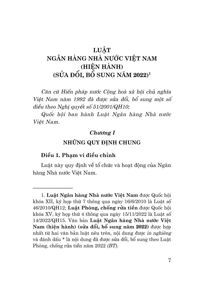 Nội dung cuốn sách là văn bản luật được hợp nhất giữa Luật Ngân hàng Nhà nước Việt Nam năm 2010 và phần nội dung được sửa đổi, bổ sung trong Luật Phòng, chống rửa tiền năm 2022.