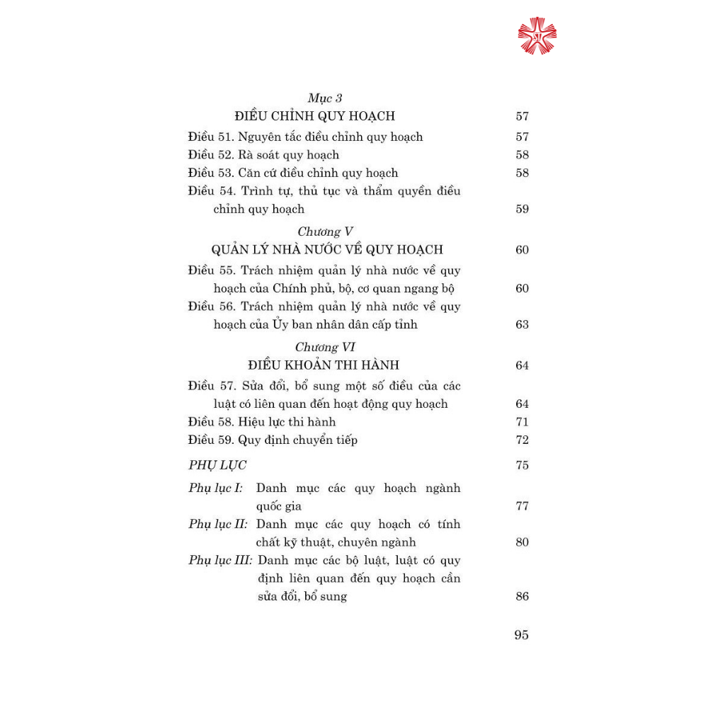 Luật quy hoạch đã được Quốc hội nước Cộng hòa xã hội chủ nghĩa Việt Nam khóa XIV, kỳ họp thứ 4 thông qua ngày 24 tháng 11 năm 2017. Luật gồm 6 chương và 59 điều quy định việc lập, thẩm định, quyết định hoặc phê duyệt, công bố, thực hiện, đánh giá, điều chỉnh quy hoạch trong hệ thống quy hoạch quốc gia; trách nhiệm quản lý nhà nước về quy hoạch. Luật này có hiệu lực thi hành từ ngày 01 tháng 01 năm 2019.