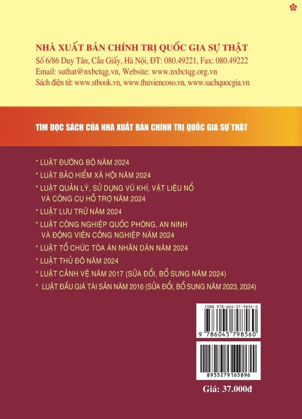 Sách Luật Công Chứng Năm 2024 Tác giả: Quốc Hội Nhà xuất bản: Chính Trị Quốc Gia Sự Thật Khổ sách: 13x19 cm Phát hành: 2025 Giá bìa:28.000 đ Số trang: 110 trang Hình thức