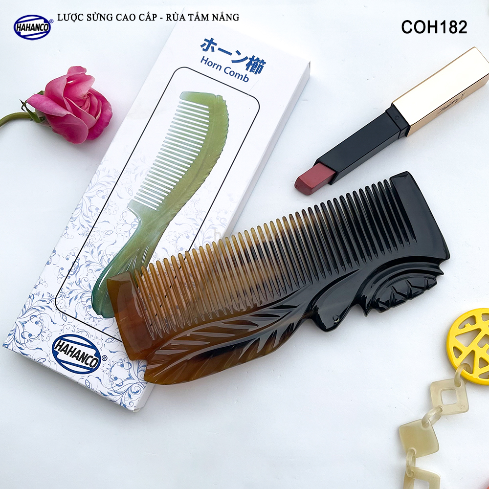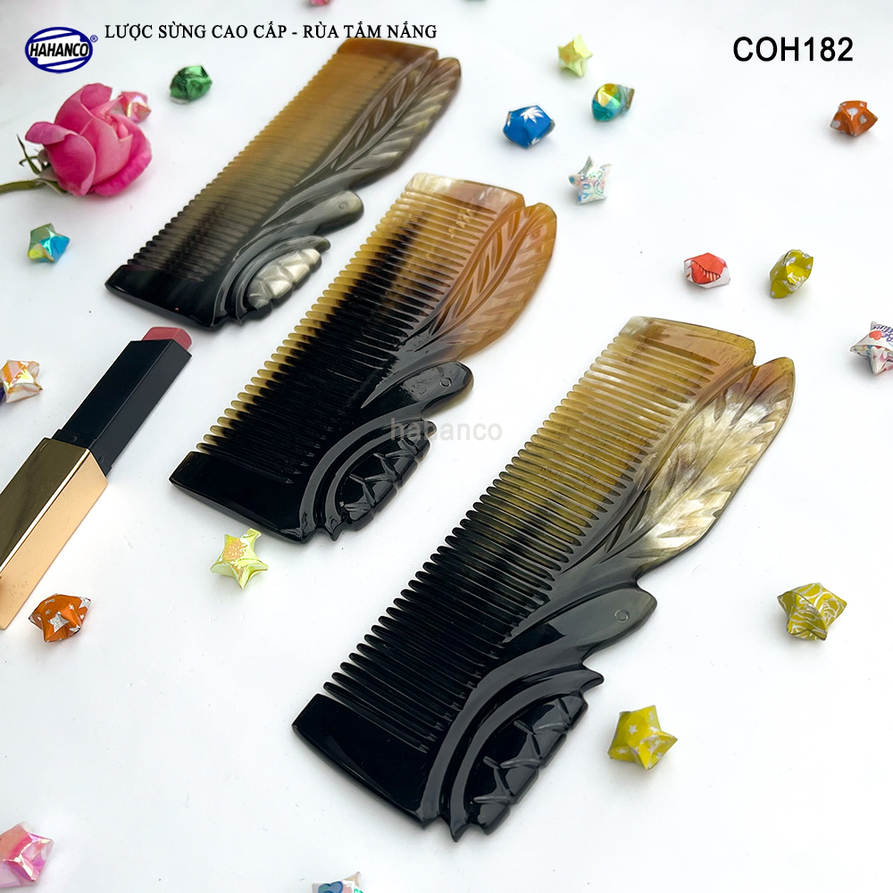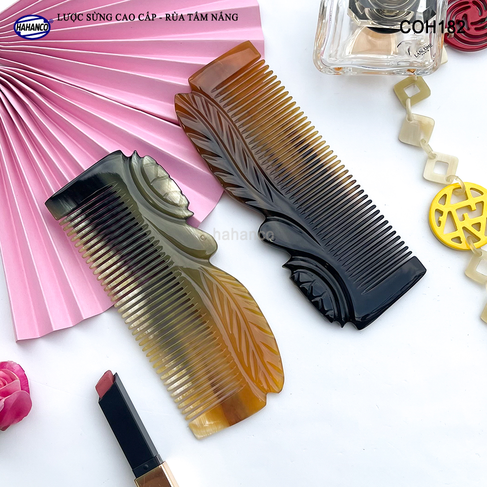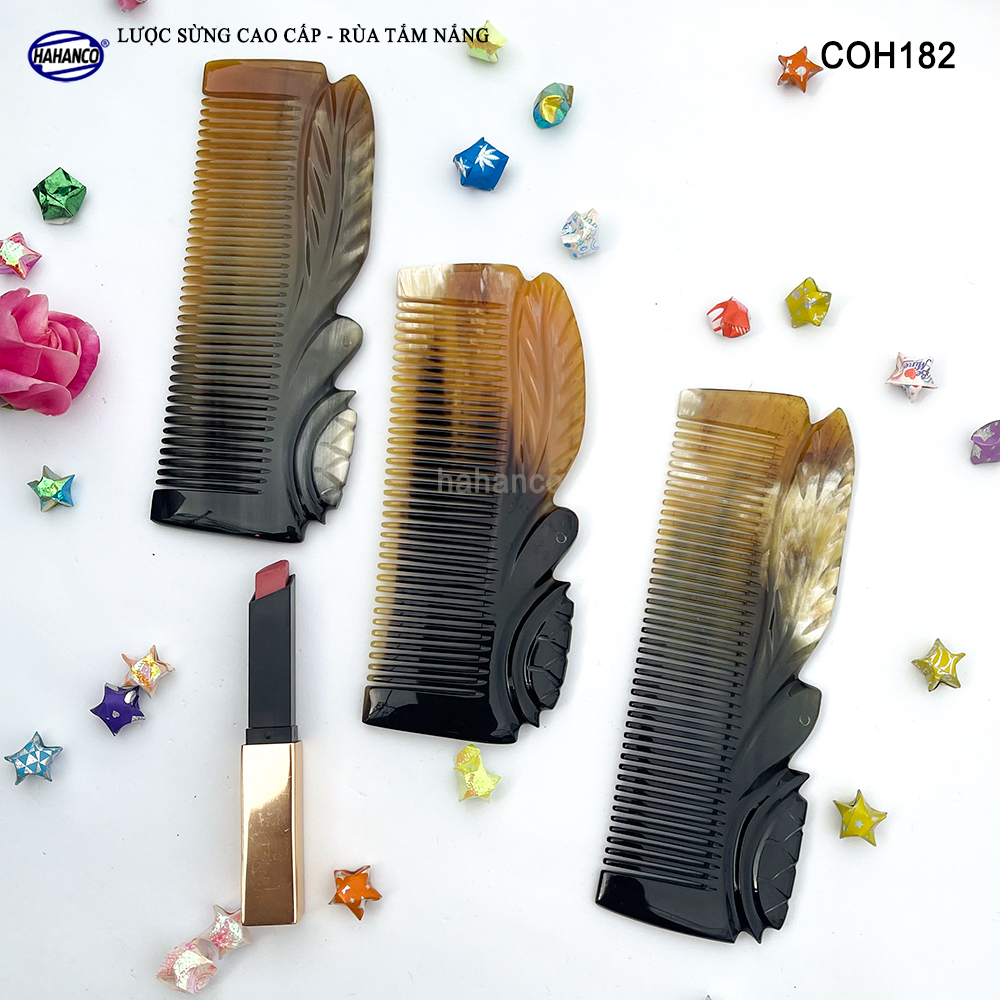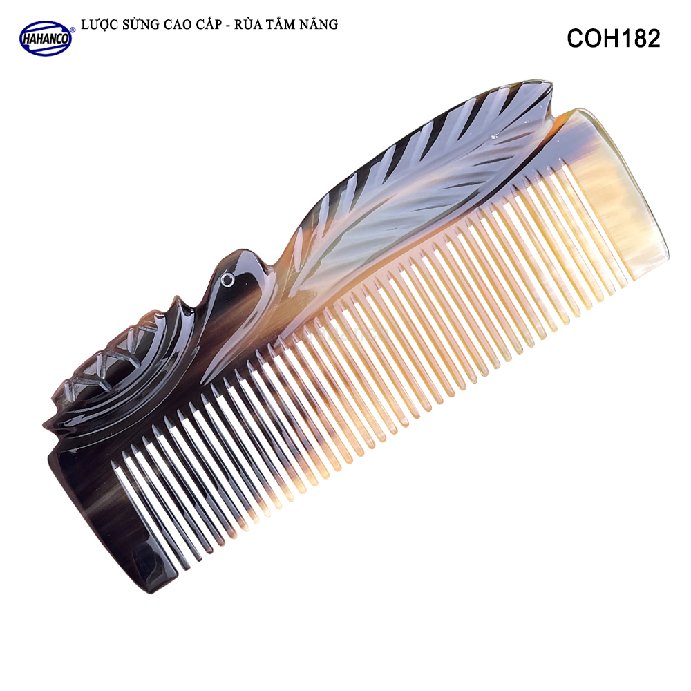 - Đây là mẫu lược sừng vân nưa cao cấp có thể bỏ túi, Được các nghệ nhân của HAHANCO làm thủ công tạo hình Rùa nằm trên lá, cắt khía vào thân lược tạo ra các đường nét uốn lượn với những đường tỉa tách họa tiết sống động sắc sảo trên thân lược.