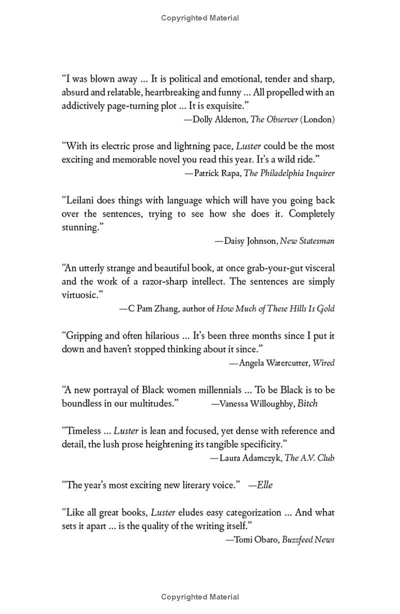 Irresistibly unruly and strikingly beautiful, razor-sharp and slyly comic, sexually charged and utterly absorbing, Raven Leilani’s Luster is a portrait of a young woman trying to make sense of her life―her hunger, her anger―in a tumultuous era. It is also a haunting, aching description of how hard it is to believe in your own talent, and the unexpected influences that bring us into ourselves along the way.
