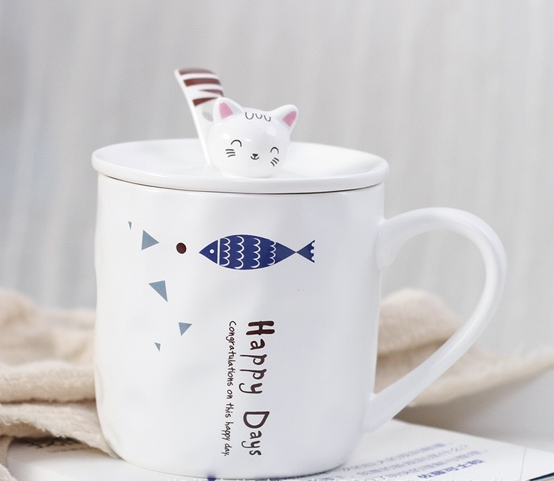 - Ly gốm sứ Mèo nắp sứ màu Trắng 350ml