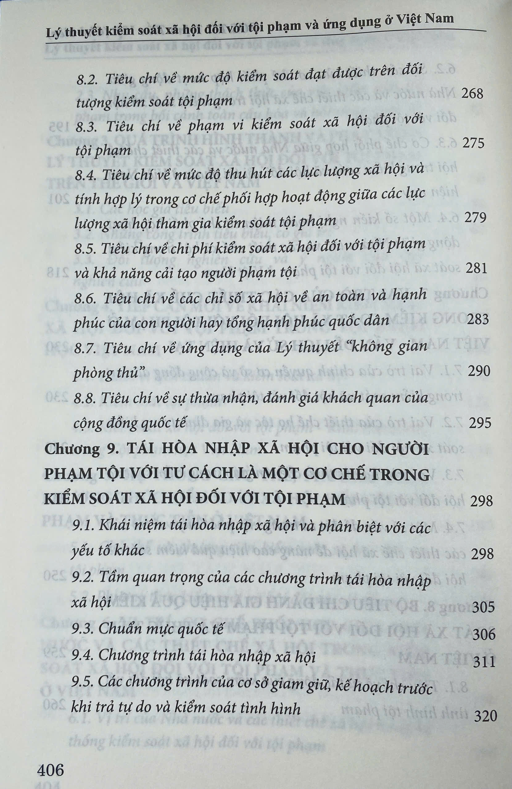 Chương 8: Tác giả giới thiệu về bộ tiêu chí đánh giá hiệu quả kiểm soát xã hội đối với tội phạm và thực tiễn ở Việt Nam gồm: Tiêu chí về sự tác động của kiểm soát xã hội đối với tình hình tội phạm; Tiêu chí về mức độ kiểm soát đạt được trên đối tượng kiểm soát; Tiêu chí về phạm vi kiểm soát xã hội đối với tội phạm; Tiêu chí về mức độ thu hút các lực lượng xã hội và tính hợp lý trong cơ chế phối hợp hoạt động giữa các lực lượng xã hội tham gia kiểm soát tội phạm; Tiêu chí về chi phí kiểm soát tội phạm và khả năng cải tạo người phạm tội; Tiêu chí về các chỉ số xã hội về an toàn và hạnh phúc của con người hay tổng hạnh phúc quốc dân; Tiêu chí về ứng dụng của Lý thuyết “không gian phòng thủ”; Tiêu chí về sự thừa nhận, đánh giá khách quan của cộng đồng quốc tế.