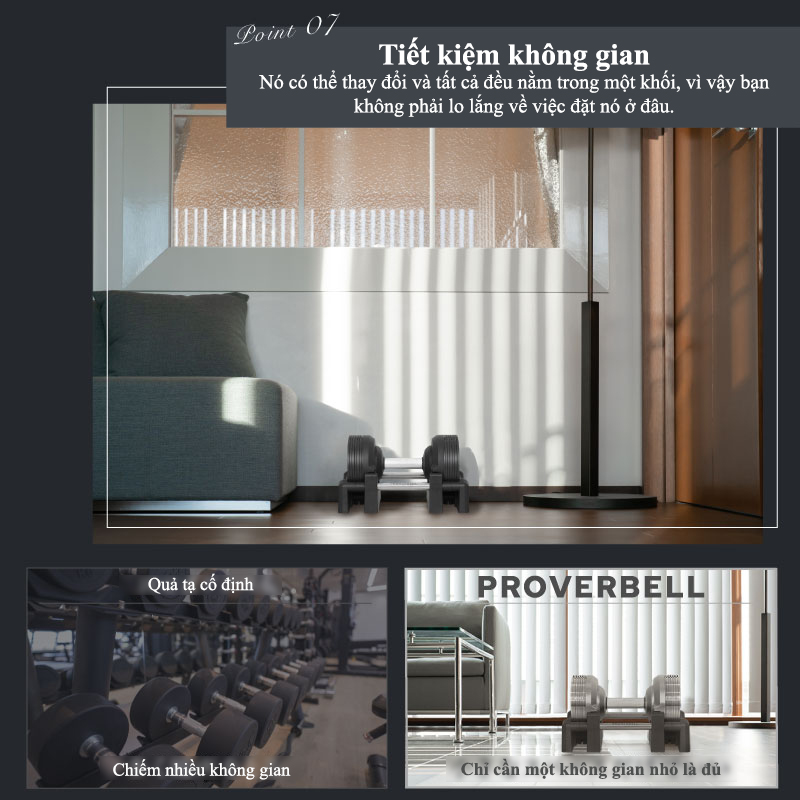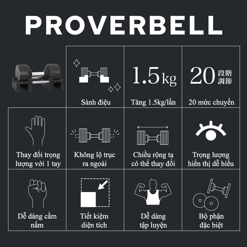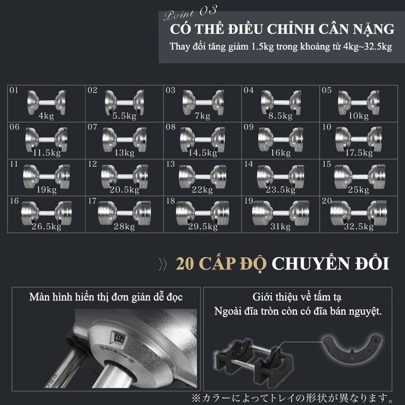 Thông tin tạ tay điều chỉnh 20 Kg - Tạ tay điều chình 20 Kg được thiết kế chắc chắn, với tính thẩm mỹ cao. Có kèm đế đỡ tiện lợi, tránh gây trầy xước cho tạ.