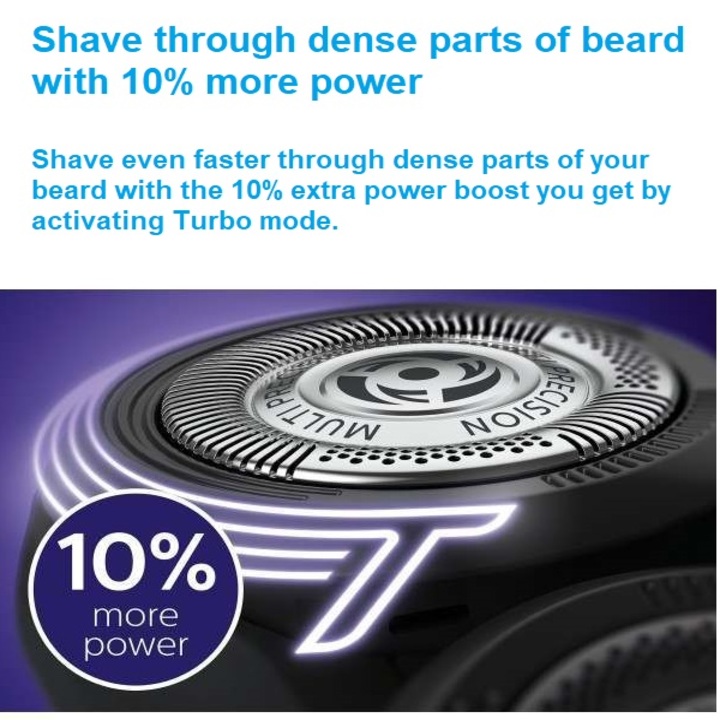 • Chọn cách cạo râu bạn thích. Với đầu bịt Khô & Ướt Aquatec, bạn có thể chọn cạo khô nhanh và thoải mái. Hoặc bạn có thể cạo ướt với kem cạo râu hay bọt cạo râu, kể cả khi tắm.  Cạo qua những phần râu rậm rạp với sức mạnh nhiều hơn 10% - Cạo nhanh hơn qua những phần râu rậm rạp với khả năng tăng thêm 10% sức mạnh khi kích hoạt chế độ Turbo Đầu cạo linh hoạt theo 5 hướng để cạo nhanh và sát