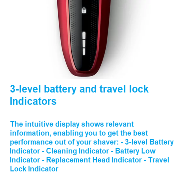 • Trên thân máy cạo râu tích hợp 3 mức đèn hiện thị rõ ràng giúp người dùng nắm được tình trạng chính xác của máy để có thể sử dụng một cách hiệu quả nhất gồm có: 3 mức pin chỉ báo và đèn báo khóa.