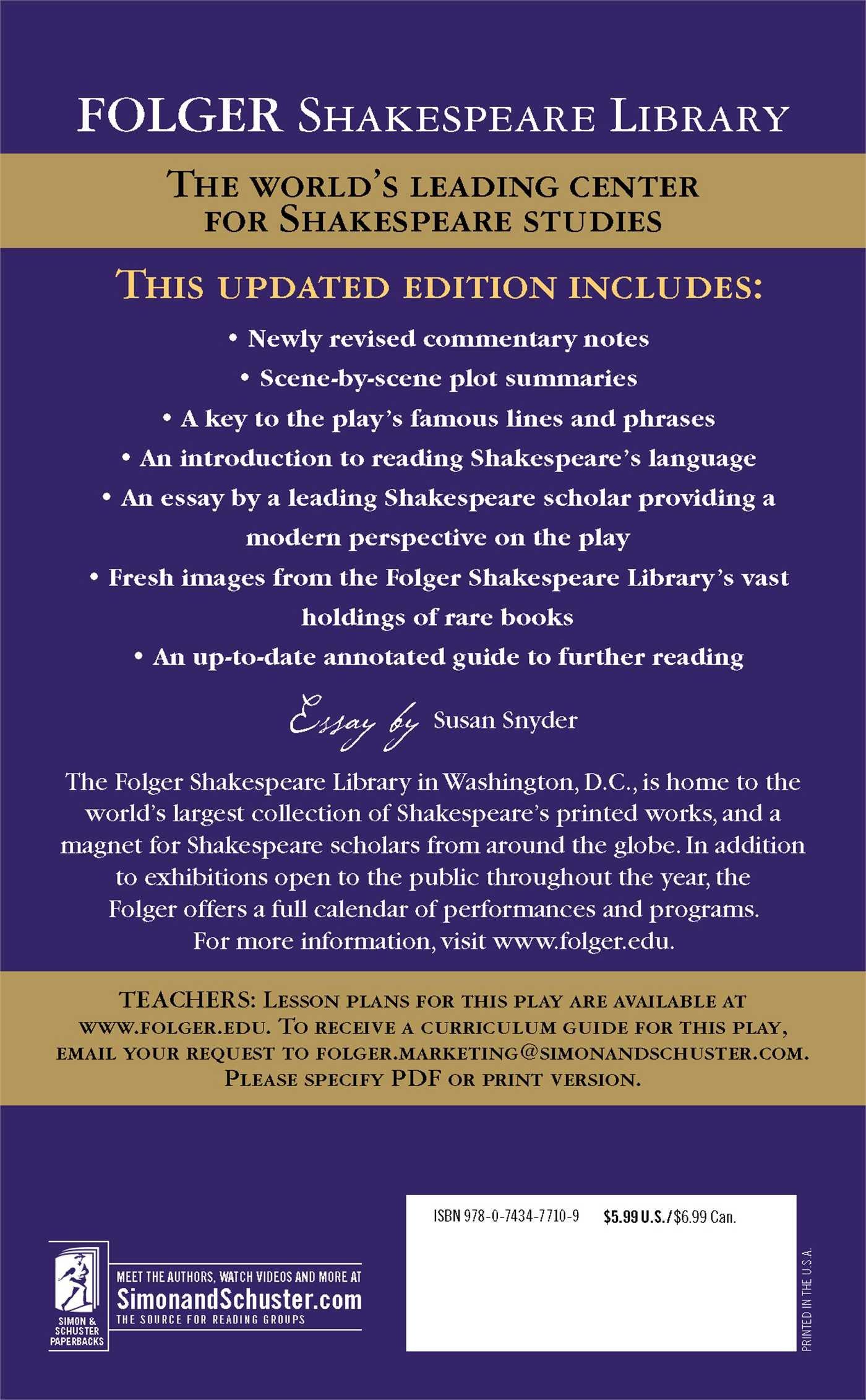 "Each edition includes: " - Freshly edited text based on the best early printed version of the play - Full explanatory notes conveniently placed on pages facing the text of the play - Scene-by-scene plot summaries - A key to famous lines and phrases - An introduction to reading Shakespeare's language - An essay by an outstanding scholar providing a modern perspective on the play - Illustrations from the Shakespeare Library's vast holdings of rare books "Essay by" Susan Snyder The Shakespeare Library in Washington, D.C., is home to the world's largest collection of Shakespeare's printed works, and a magnet for Shakespeare scholars from around the globe. In addition to exhibitions open to the public throughout the year, the offers a full calendar of performances and programs. For more information, visit .