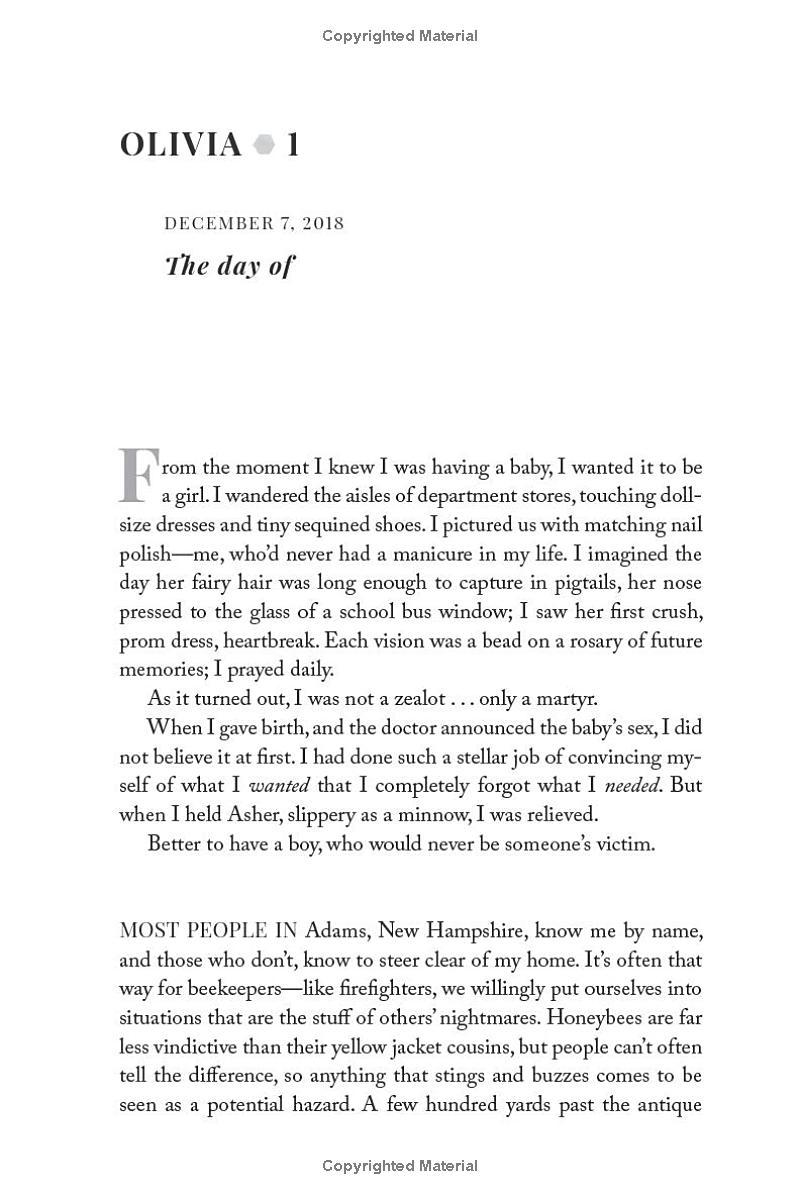Olivia fled her abusive marriage to return to her hometown and take over the family beekeeping business when her son Asher was six. Now, impossibly, her baby is six feet tall and in his last year of high school, a kind, good-looking, popular ice hockey star with a tiny sprite of a new girlfriend.