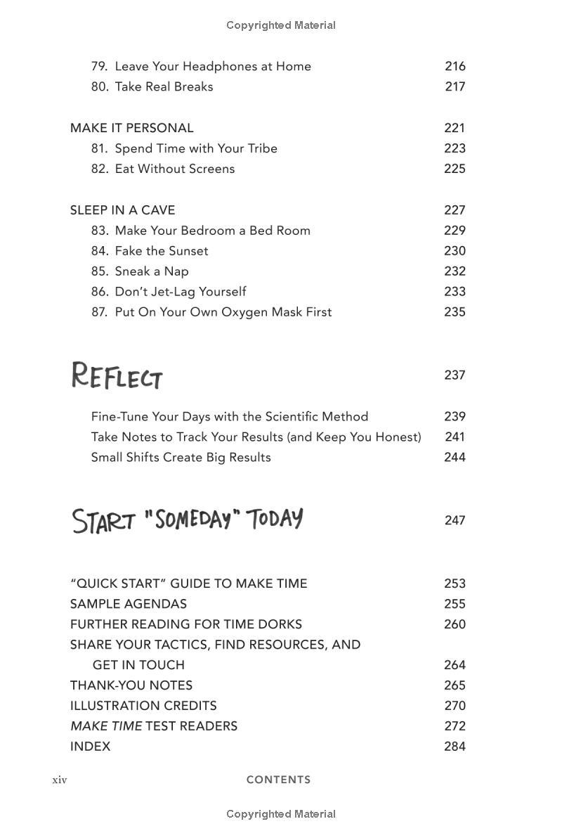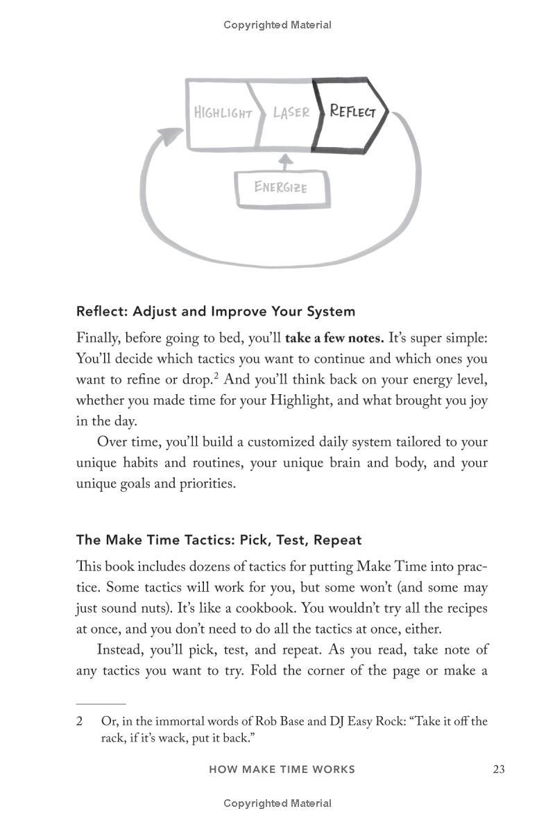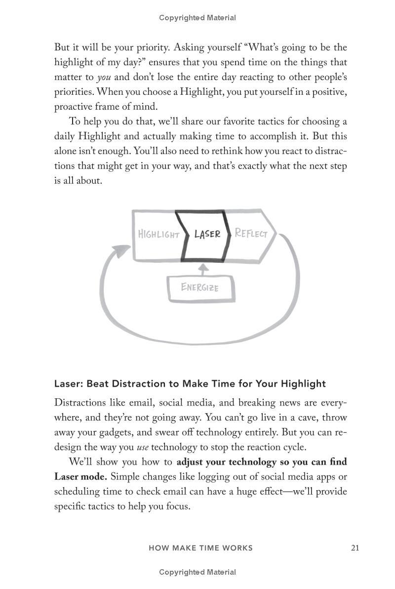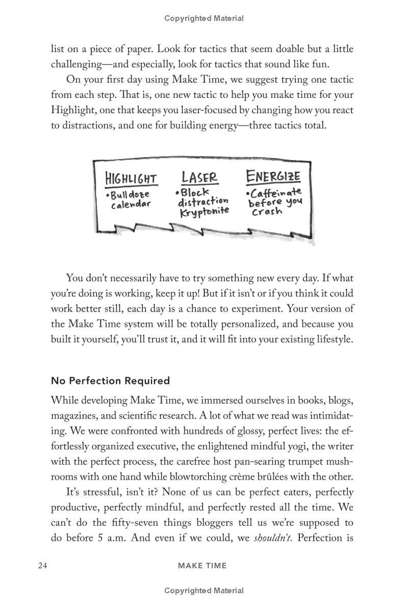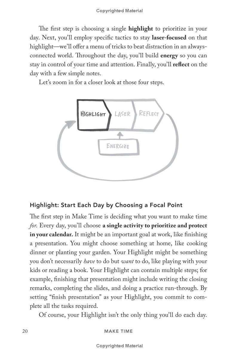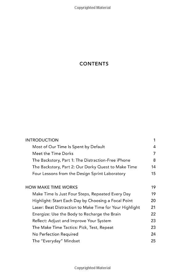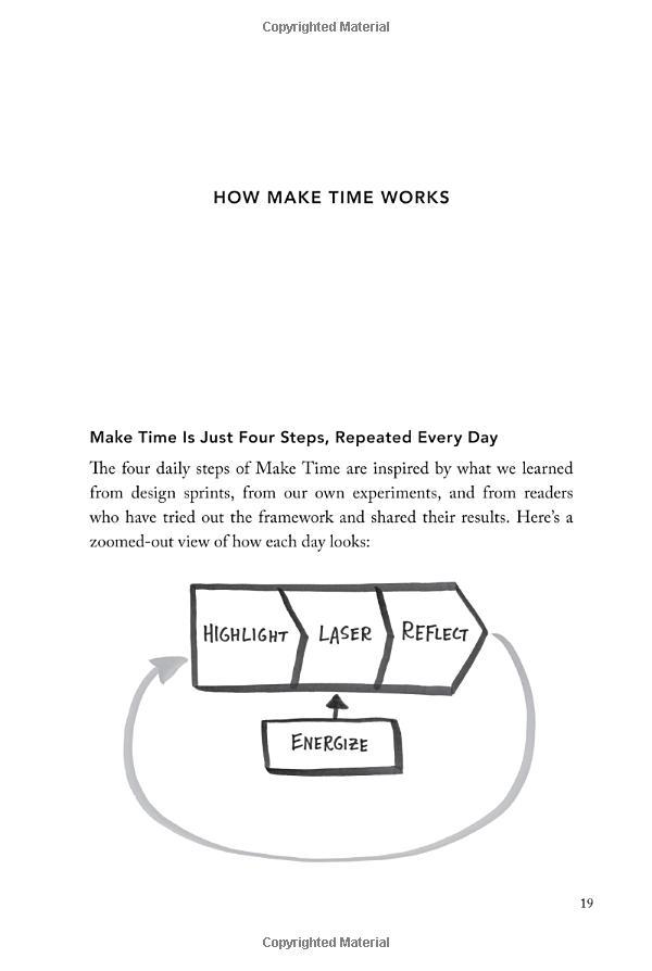 From the New York Times bestselling authors of Sprint, a simple 4-step system for improving focus, finding greater joy in your work, and getting more out of every day. Nobody ever looked at an empty calendar and said, "The best way to spend this time is by cramming it full of meetings!" or got to work in the morning and thought, Today I'll spend hours on Facebook! Yet that's exactly what we do. Why? In a world where information refreshes endlessly and the workday feels like a race to react to other people's priorities faster, frazzled and distracted has become our default position. But what if the exhaustion of constant busyness wasn't mandatory? What if you could step off the hamster wheel and start taking control of your time and attention? That's what this book is about. As creators of Google Ventures' renowned "design sprint," Jake and John have helped hundreds of teams solve important problems by changing how they work. Building on the success of these sprints and their experience designing ubiquitous tech products from Gmail to YouTube, they spent years experimenting with their own habits and routines, looking for ways to help people optimize their energy, focus, and time. Now they've packaged the most effective tactics into a four-step daily framework that anyone can use to systematically design their days. Make Time is not a one-size-fits-all formula. Instead, it offers a customizable menu of bite-size tips and strategies that can be tailored to individual habits and lifestyles. Make Time isn't about productivity, or checking off more to-dos. Nor does it propose unrealistic solutions like throwing out your smartphone or swearing off social media. Making time isn't about radically overhauling your lifestyle; it's about making small shifts in your environment to liberate yourself from constant busyness and distraction. A must-read for anyone who has ever thought, If only there were more hours in the , Make Time will help you stop passively reacting to the demands of the modern world and start intentionally making time for the things that matter .