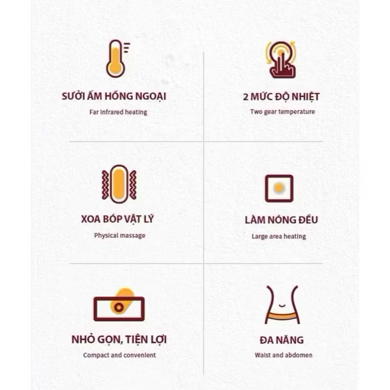 Chức năng chính : Chườm ấm giảm đau vùng eo, thắt lưng, giảm đau bụng kinh, kích thích đẩy huyết tháng ra ngoài, massage ánh sáng đỏ, sản sinh collagen tái tạo cơ, hỗ trợ làm tan mỡ thừa, làm mờ vết thâm rạn nếp nhăn hậu sản, thúc đẩy tuần hoàn máu, trả lại làn da căng mịn hồng hào.