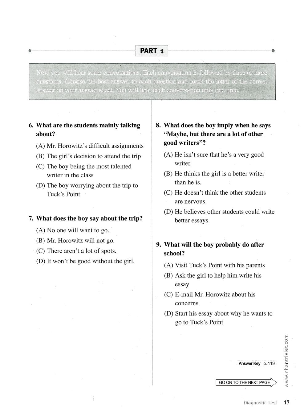 The Diagnostic Test: This section of the book will assess your current listening ability. The diagnostic test tells you your listening strengths and also what you should focus on to improve your skills. Additionally the diagnostic test gives you a grade you can refer back to once you take the practice tests to see how much your listening skill has improved since you began this book.