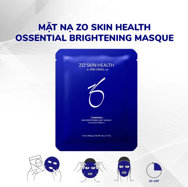 - Cung cấp độ ẩm và nuôi dưỡng da Cách dùng Zo Skin Health Ossential Brightening Masque Dùng mặt nạ trắng da Zo Ossential Brightening Masque từ 1-2 lần/ tuần. Sau khi làm sạch da, tháo mặt nạ khỏi lớp lót trong suốt. Tiến hành đắp mặt nạ trước tiên cho vùng mắt, sau đó đến các phần còn lại của khuôn mặt. Nhẹ nhàng thoa đều mặt nạ lên mặt để đảm bảo da tiếp xúc tốt. Để mặt nạ trong 10-15 phút. Sau đó, tháo mặt nạ ra và thoa nhẹ nhàng để các tinh chất còn sót trên bề mặt da thẩm thấu tốt hơn. Những ai nên dùng Zo Skin Health Ossential Brightening Masque