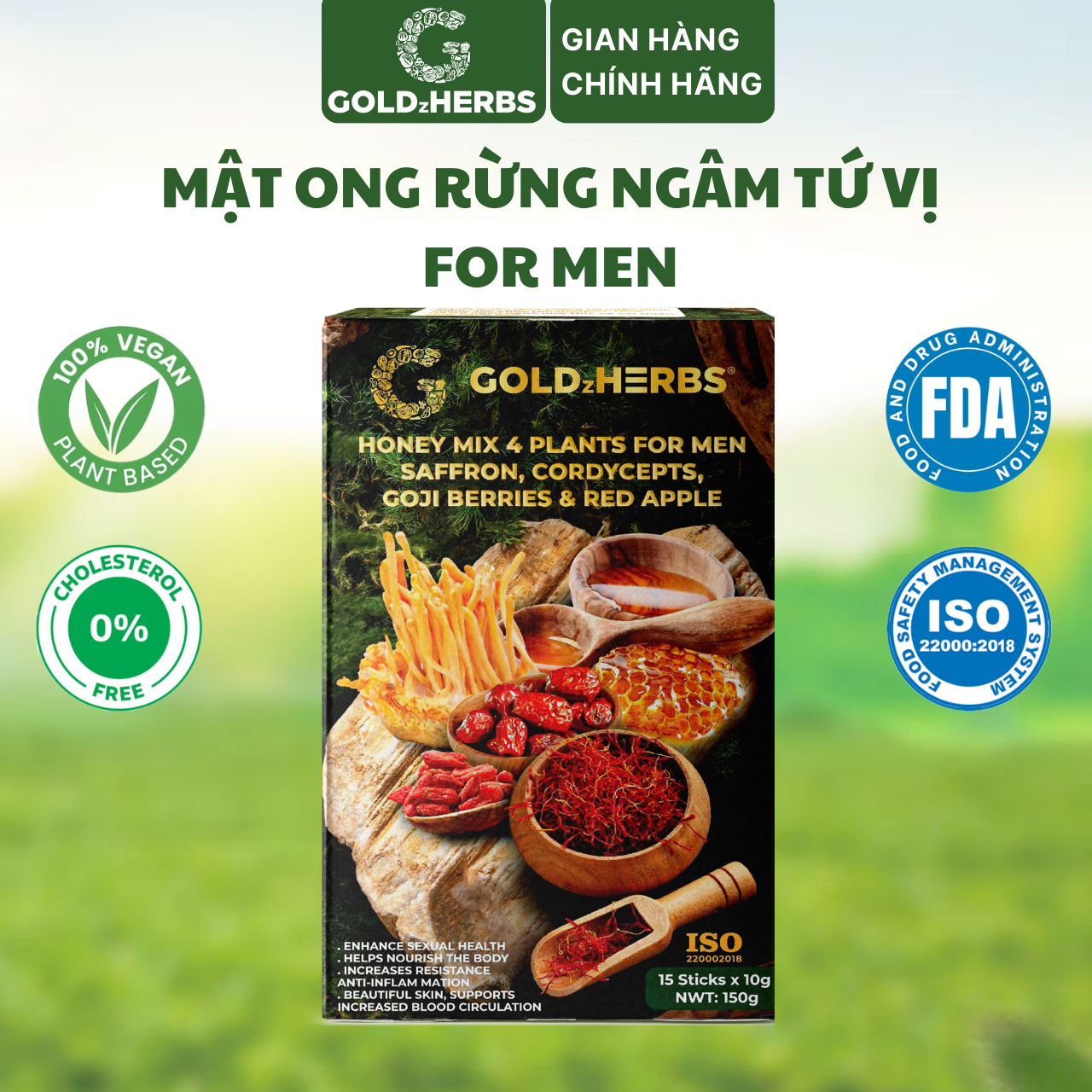 Mật ong rừng ngâm tứ vị For Men GoldzHerbs Sự kết hợp của các thành phần như saffron, đông trùng hạ thảo, kỷ tử, táo đỏ ngâm đẫm trong mật ong nguyên chất tạo nên