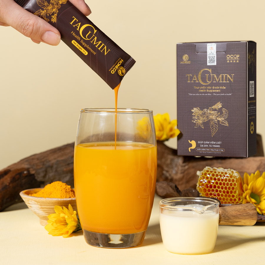 Tacumin là sự kết hợp hoàn hảo giữa: mật ong tự nhiên, sữa ong chúa tươi và Curcumin chất quý chiết xuất từ củ nghệ vàng với giải pháp kỹ thuật tiên tiến, công thức tối ưu, làm vượt trội và cộng hưởng công dụng của sản phẩm giúp hỗ trợ bảo vệ niêm mạc đường tiêu hóa, hỗ trợ trung hòa acid dạ dày, giảm viêm loét dạ dày, tá tràng.