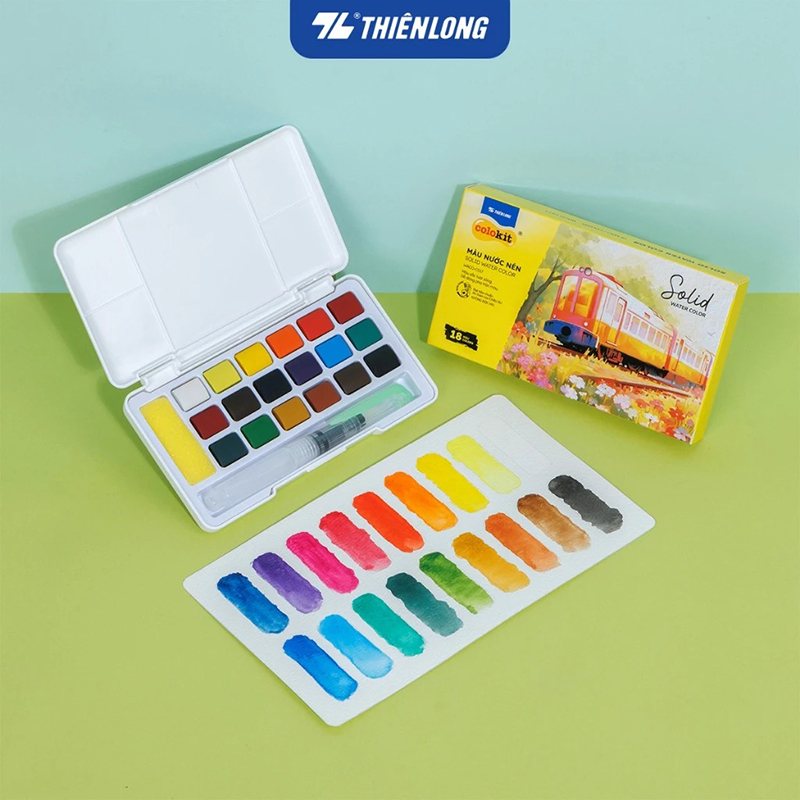 Màu nước nén Solid Watercolor Thiên Long Colokit với 12/18/24 màu sắc tươi sáng, an toàn đạt tiêu chuẩn châu Âu. Màu vẽ mịn, dễ dàng pha trộn và cho ra màu sắc cực kỳ chuẩn trên giấy. Hộp màu đính kèm cọ vẽ bên trong, tiện dụng và đẹp mắt. Dễ dàng điều chỉnh độ đậm nhạt của màu sắc theo ý thích.