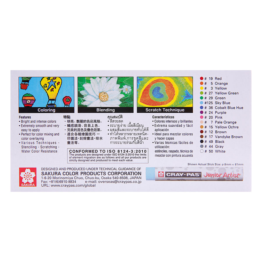 Sáp Dầu Sakura Craypas Junior Artist 16 Màu Sản phẩm có màu sắc tươi sáng, độ bền cao, độ nhấn chồng màu tốt, có thể pha trộn các màu với nhau để tạo ra những sắc