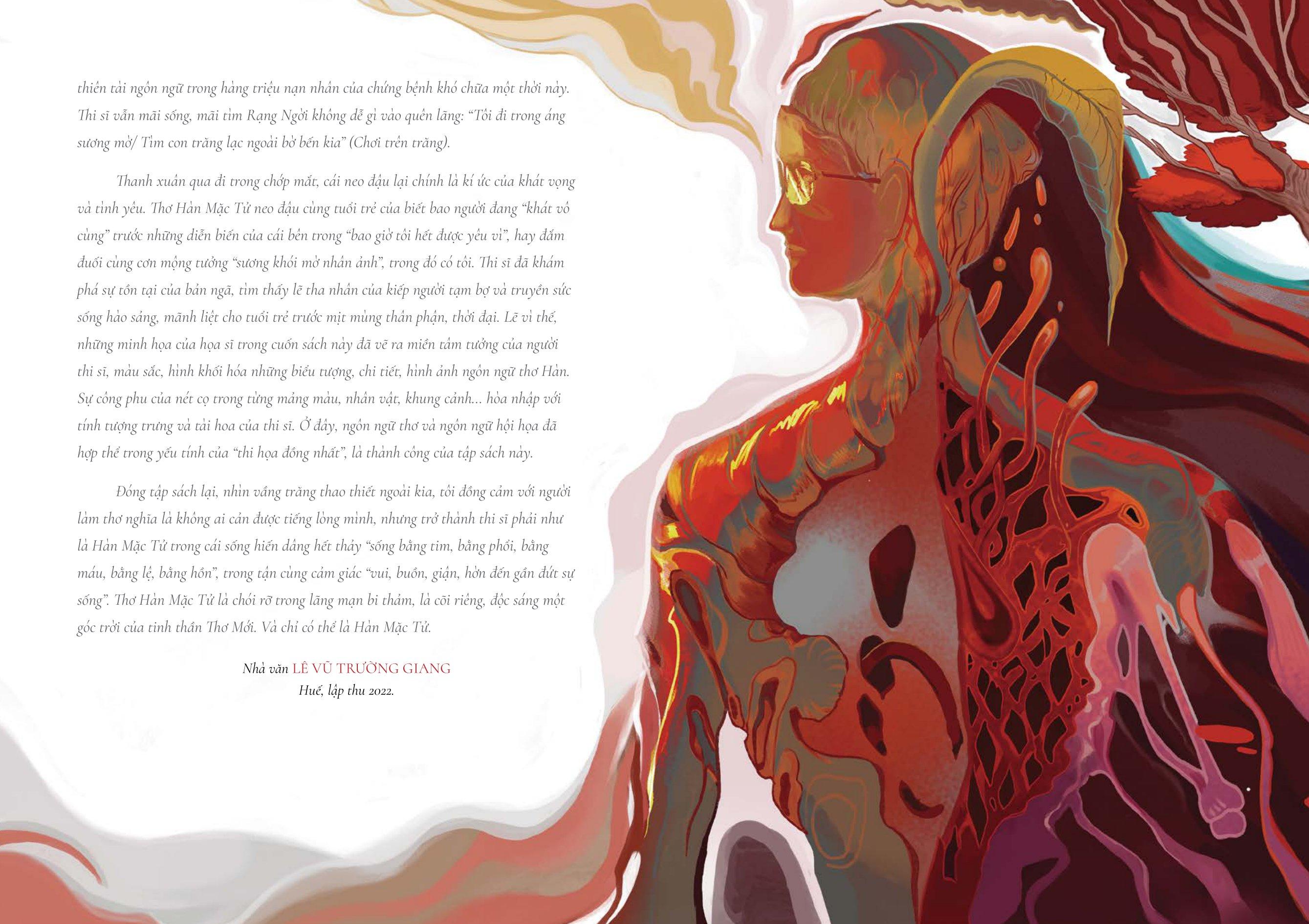 “Thanh xuân qua đi trong chớp mắt, cái neo đậu lại chính là kí ức của khát vọng và tình yêu. Thơ Hàn Mặc Tử neo đậu cùng tuổi trẻ của biết bao người đang “khát vô cùng" trước những diễn biến của cái bên trong “bao giờ tôi hết được yêu vì”, hay đắm đuối cùng cơn mộng tưởng “sương khói mờ nhân ảnh”, trong đó có tôi. Thi sĩ đã khám phá sự tồn tại của bản ngã, tìm thấy lẽ tha nhân của kiếp người tạm bợ và truyền sức sống hảo sảng, mãnh liệt cho tuổi trẻ trước mịt mùng thân phận, thời đại. Lẽ vì thế, những minh họa của họa sĩ trong cuốn sách này đã vẽ ra miền tâm tưởng của người thi sĩ, màu sắc, hình khối hóa những biểu tượng, chi tiết, hình ảnh ngôn ngữ thơ Hàn. Sự công phu của nét cọ trong từng mảng màu, nhân vật, khung cả hòa nhập với tính tượng trưng và tài hoa của thi sĩ. Ở đây, ngôn ngữ thơ và ngôn ngữ hội họa đã hợp thể trong yếu tính của “thi họa đồng nhất”, là thành công của tập sách này.” (Nhà văn Lê Vũ Trường Giang)