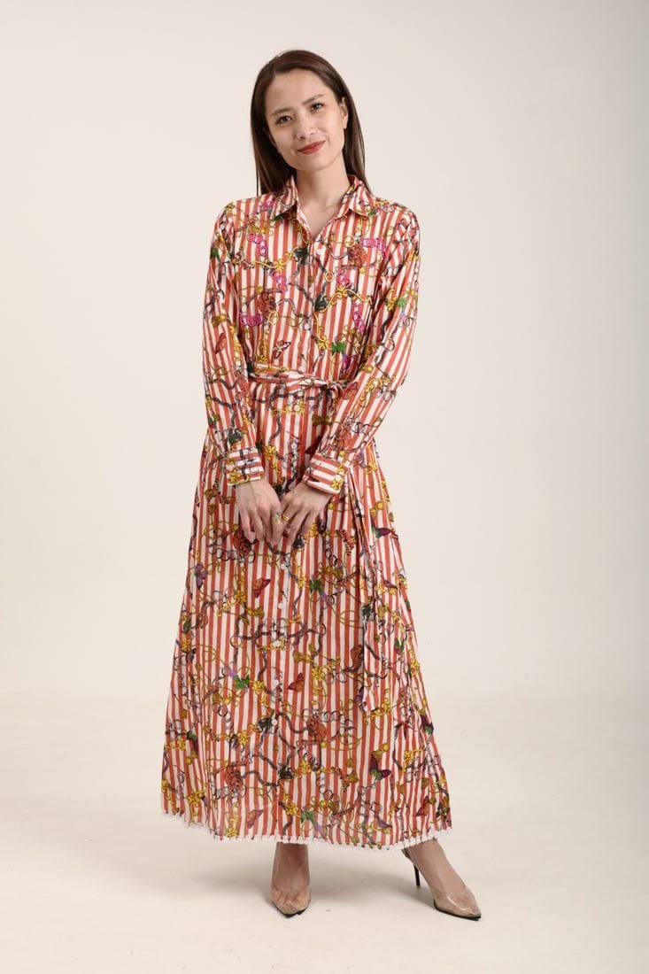 Maxi Sơ Mi Cotton Cao Cấp Luna Llena, chất cotton mềm mại cao cấp. Nền vải sọc ánh kim tinh tế. Màu sắc nhẹ nhàng, trang nhã. Có lớp lót. Dài 128cm (45x128) Phù