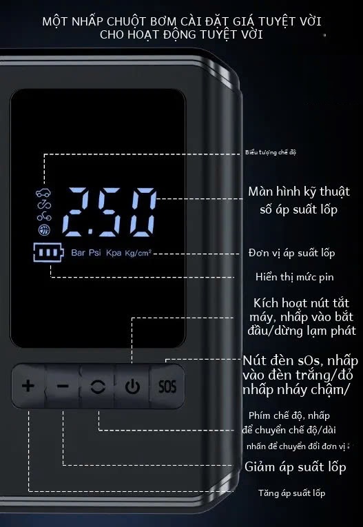 - Kích thước nhỏ gọn, thiết kế tối giản không dây, pin sạc dung lượng lớn dễ dàng thao tác mang theo và sử dụng. - Màn hình KTS lớn hiển thị đầy đủ các chỉ số áp suất PSI, Kpa, Bar, Kg/cm2 - Tự dộng tắt khi bơm tới mức áp suất thiết lập trước.