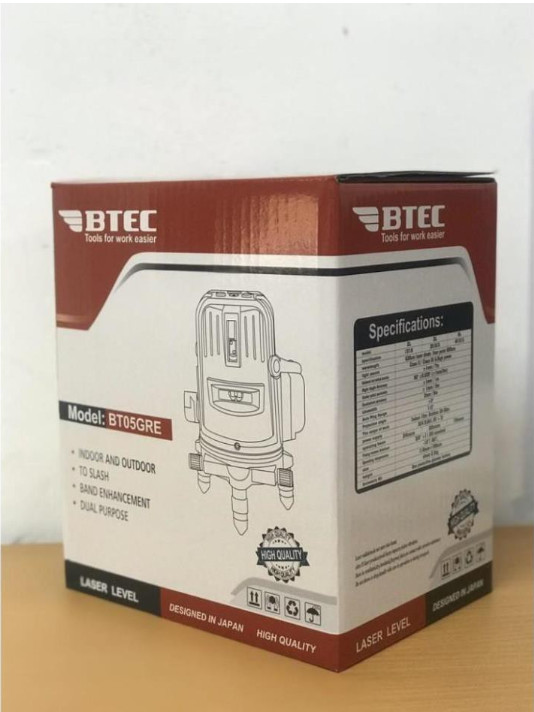 Máy cân mực 5 tia xanh BTEC BT-05GRE cho độ sáng cao và kết quả chính xác  Máy cân mực laser BTEC BT-05GRE  được sử dụng rộng rãi trong ngành xây dựng, thi công lắp đặt các thiết bị công trình. Máy cân mực thiết kế có tới 5 tia xanh sẽ cho kết quả chính xác. Máy cân bằng laser sử dụng tia laser màu xanh sẽ có độ sáng cao, rõ nét hơn, cho hiệu quả công việc cao nhất.