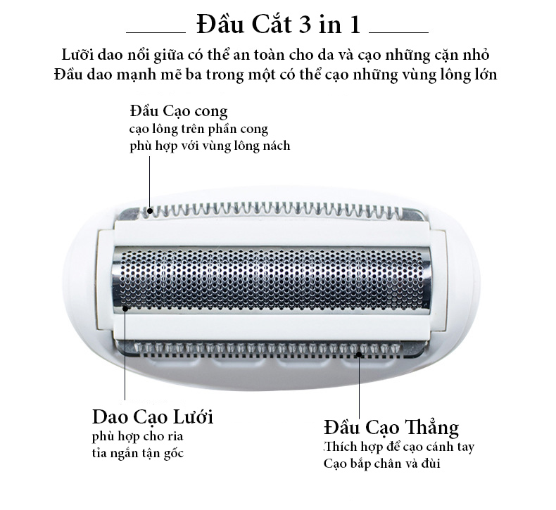  Làm sạch lông vùng k ín giúp chị em phụ nữ loại bỏ, vệ sinh, triệt lông thừa trên cơ thể như lông nách, tẩy lông vùng k ín bikini, lông chân, lông tay, lông mũi, lông chân mày, lông mày  Máy cạo lông toàn thân đa năng cho nữ đi kèm với bộ bảo vệ an toàn và phụ kiện tông đơ, chổi quét làm sạch và dây sạc.  Cạo lông mày được thiết kế thông minh, nhỏ gọn, tiện dụng, vừa vặn tay cầm, có thể mang theo sử dụng mọi lúc mọi nơi  Máy làm sạch hoàn hảo cho những vùng nhạy cảm nhất của bạn như bikini, nách, đầu gối và mắt cá chân. Không có vết sẹo hoặc kích ứng thường gây ra khi cạo bằng dao cạo.  Đèn LED tích hợp giúp bạn dễ dàng nhìn thấy mỗi lần sạc  Máy cạo lông toàn thân đa năng cho nữ không gây dị ứng và hoàn hảo cho mọi loại da.  Đầu cạo của máy dễ dàng tháo rời khi vệ sinh. Kích thước của máy vô cùng nhỏ gọn, có thể dễ dàng cầm, nắm trong lòng bàn tay khi sử dụng.  Máy cạo lông toàn thân gồm 4 đầu: