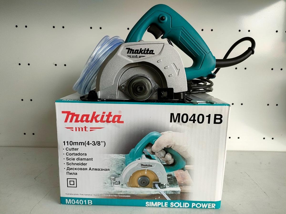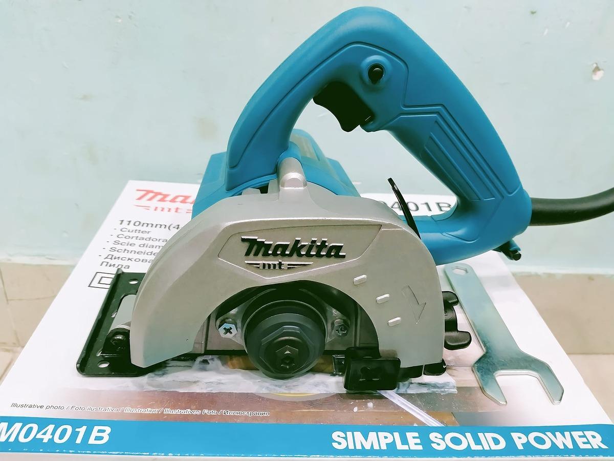 Trong hộp có: Máy cắt gạch Makita M0401B, cờ lê, khóa lục giác. Máy không kèm đĩa cắt.