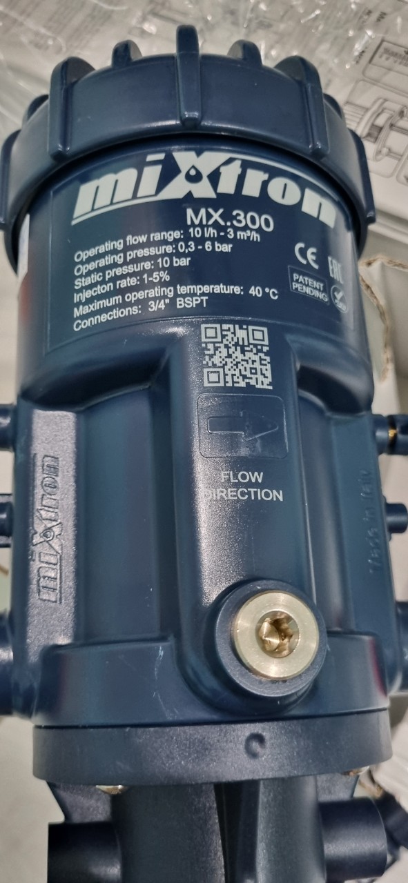 Máy châm phân/ Máy pha thuốc Mixtron MX.300.P150. - Lưu lượng nước qua máy đến 3000 lít / giờ. - Tỉ lệ định lượng : 1 - 5% - Kết nối ống: 27mm - Áp