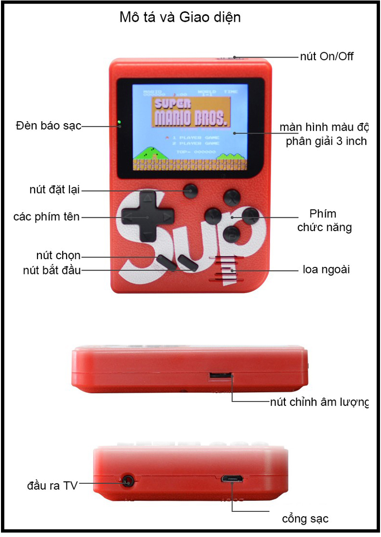 Máy chơi game cầm tay 4 nút Sup hơn 400 trò, tuỳ chọn thêm tay cầm, kết nối với TV Ôn lại tuổi thơ với chiếc máy chơi game điện tử 4 nút ngày xưa đã để lại rất nhiều kỉ niệm trong lòng mỗi người thời 8x, 9x. Máy được tích hợp sẵn 400 game với phiên bản nâng cấp Plus bao gồm Mario, Contra, Natra cứu mẹ, Trang bị màn hình màu LCD 3-inch chơi game cực đã. Bảng điều khiển 4 nút hệt như game máy game thùng, điện tử 4 nút ngày xưa. Có thể truyền hình ảnh, âm thanh lên TV thông qua cổng AV. Thời lượng pin khoảng 2 - 4 giờ chơi. Ưu điểm nổi bật của Máy chơi game cầm tay 4 nút Sup hơn 400 trò, tuỳ chọn thêm tay cầm, kết nối với TV: • Máy được tích hợp sẵn 400 game Retro bao gồm #Mario #Contra #Natra cứu mẹ, • Trang bị màn hình màu LCD 3-inch chơi game cực đã. • Bảng điều khiển 4 nút hệt như game máy game thùng, điện tử 4 nút ngày xưa. • Có thể truyền hình ảnh, âm thanh lên TV thông qua cổng AV. • Thời lượng pin khoảng 6 giờ chơi. Thông số kỹ thuật sản phẩm: • Màu sắc: Đen,Xanh,Đỏ • Màn hình LCD : 3 inch • Được xây dựng trong: 400 trò chơi • Ngôn ngữ: Tiếng Anh ,Tiếng Trung • Loa: Có • Thời gian làm việc: 6 giờ • Pin: Pin sạc lithium ion 800 mAh-1020 mAh BỘ SẢN PHẨM BAO GỒM: 1 x Bàn điều khiển trò chơi Retro FC 1 x Hướng dẫn sử dụng 1 x Cáp AV 1 x Cáp sạc USB 1 x Hộp đựng sản phẩm.