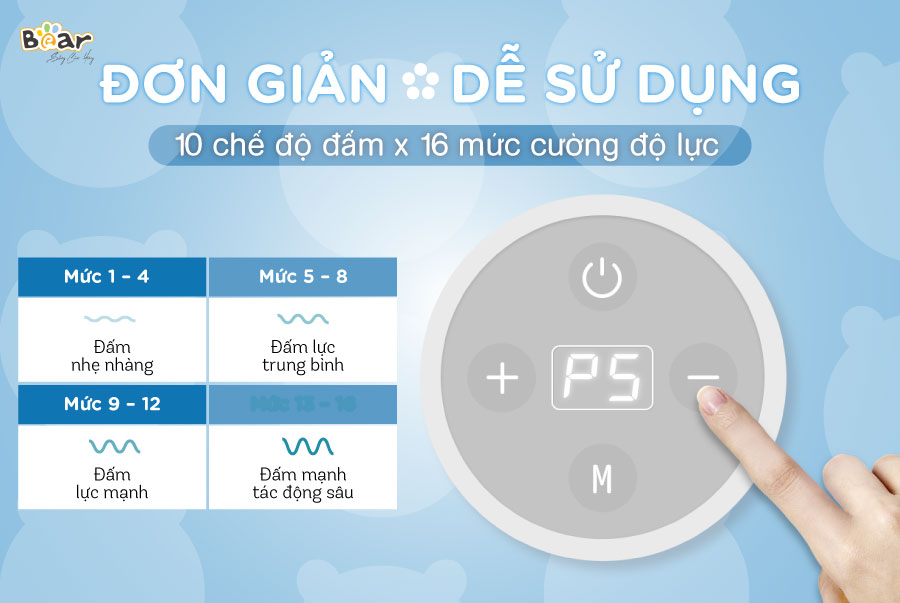 Máy đấm lưng Bear được thiết kế dựa trên sinh lý cơ thể người kết hợp với công việc và thói quen trong cuộc sống hiện đại. Sản phẩm có tác dụng làm giảm đau mỏi vùng vai cổ và lưng, thúc đẩy quá trình tuần hoàn máu. Đặc biệt bạn có thể thay đổi 16 tốc độ đấm bóp nhanh, chậm khác nhau cùng 4 chế độ: Đấm nhanh, đấm 1 tray, đấm 2 tay, đấm chậm phù hợp với từng sở thích và vùng cơ thể khác nhau.