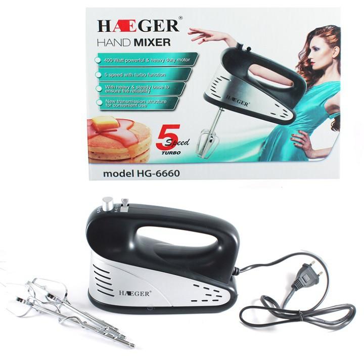 Máy đánh trứng Loại 400w 5 tốc độ giá 259k Máy đánh trứng Loại 500w giá 279k Công việc của chị em phụ nữ giờ đây thật nhẹ nhàng hơn với bộ sản phẩm máy đánh trứng cầm tay đa năng. Thông số và tính năng nổi bật Tên sản phẩm: Máy đánh trứng HAEGER Điện áp: 220V - 50Hz Công suất: 400w - xay và quay đảo An toàn: Bảo vệ kép, chống đổ và chống giật Chất liệu: Thân nhựa ABS, Cây Inox Công dụng: Đánh trứng, quấy bột Mỗi máy đánh trứng gồm có hai bộ que: 2 que đánh trứng và 2 que trộn. Motor 400w khỏe, hiệu quả hơn khi nhào trộn so với các máy khác