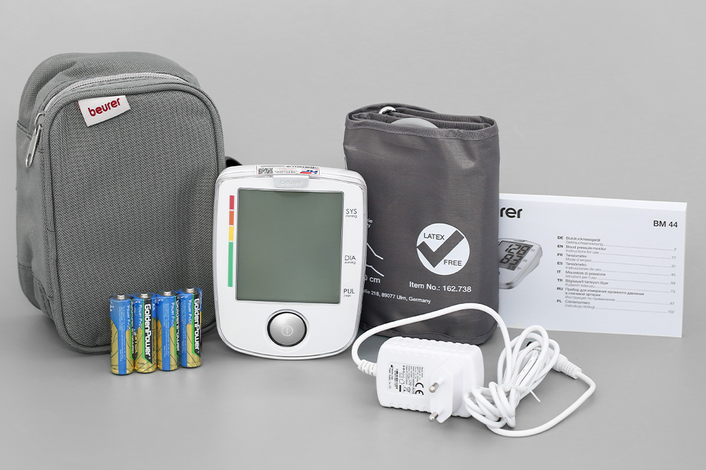 • Phụ kiện: túi đựng, hướng dẫn sử dụng, 4 pin AA Hướng dẫn sử dụng máy đo huyết áp bắp tay Beurer BM44