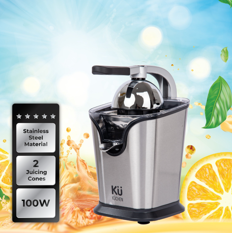 Máy vắt cam Küchen KU 2401 thiết kế hiện đại, cấu tạo chắc chắn, chất liệu bền bỉ, vắt ép hiệu quả và an toàn cho người dùng thưởng thức ly nước ép nguyên chất thơm ngon, vệ sinh.