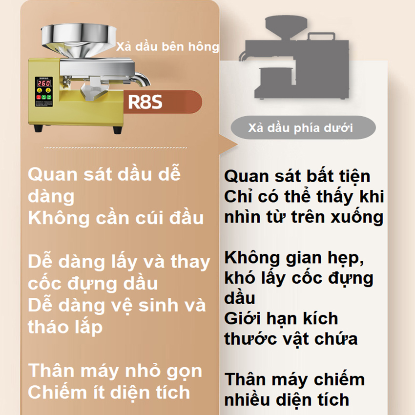 - Vấn đề sức khỏe hiện nay đang rơi vào tình trạng đáng báo động khi, các chủ cơ sở sản xuất, hộ kinh doanh dầu ăn chỉ chạy theo lợi nhuận mà bất chấp cung cấp ra thị trường các loại dầu ăn giả, kém chất lượng, gây tổn hại đến sức khỏe và tính mạng người tiêu dùng. Cách tốt nhất bảo vệ bản thân và mọi người trong gia đình đó chính là tự ép dầu thực vật ngay tại nhà. Giới thiệu máy ép dầu thực vật hoàn toàn mới, thế hệ thứ 4 Septree R8S Máy ép dầu thực vật hoàn toàn mới, thế hệ thứ 4 Septree R8S với tính năng ưu việt như: Xả dầu bên hông, momen xoắn 200nM, cảnh báo quá tải và tự động đảo chiều, cảm biến nhiệt tiên tiến....