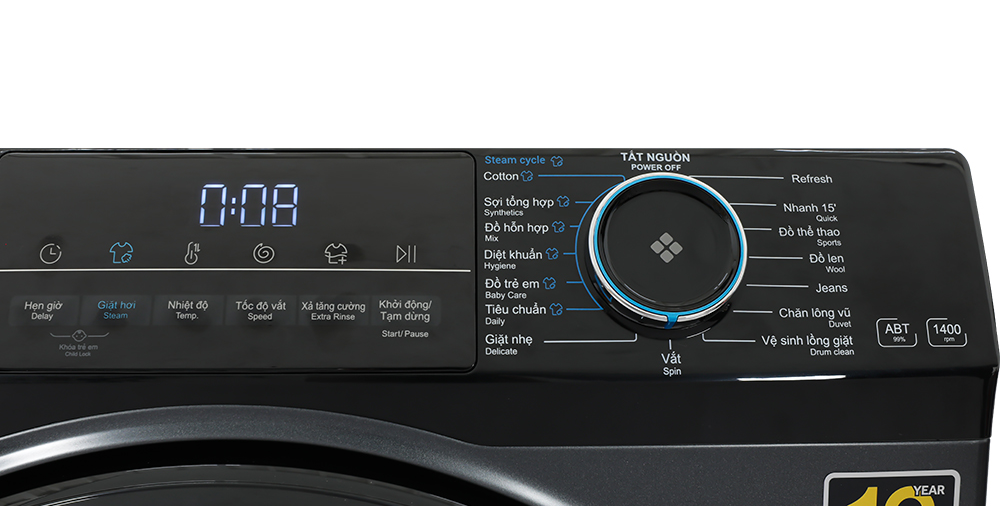 - Kiểu dáng: Thiết kế dạng máy phong cách hiện đại, tông màu đen sang trọng, tạo điểm nhấn sang trọng cho không gian sống của gia đình. - Bảng điều khiển với chương trình sử dụng bằng tiếng Việt kết hợp cùng núm xoay điều khiển, màn hình hiển thị rõ ràng, dễ hiểu giúp cho việc giặt giũ trở nên dễ dàng hơn.