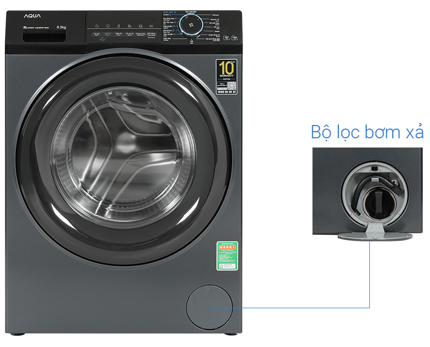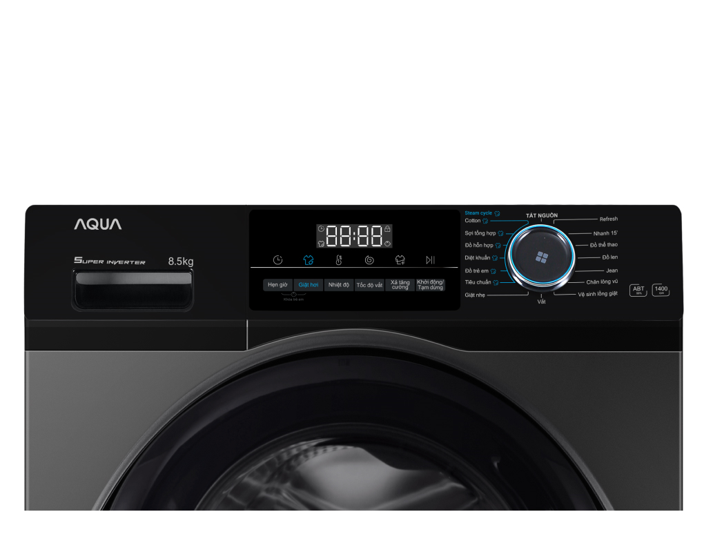 - Nhãn năng lượng chuẩn 5 sao, hiệu suất sử dụng điện là 15.6 Wh/kg. *Hình ảnh chỉ mang tính chất minh họa sản phẩm Tiện ích - Giặt nhanh 15 phút: Giặt nhanh lượng quần áo ít, quần áo ít bẩn, quần áo mỏng chỉ trong 15 phút. - Cho phép bạn dễ dàng lên lịch giặt đồ vào các mốc thời gian mong muốn, đảm bảo quần áo luôn sạch sẽ và sẵn sàng khi bạn cần chúng. - Khóa các phím chức năng, hạn chế trẻ em đùa nghịch, thao tác trên máy. Tổng quan Loại máy giặt: Cửa trước Lồng giặt: Lồng ngang Khối lượng giặt: 8.5 Kg Số người sử dụng: Từ 3 - 5 người (8 - 9 kg) Kiểu động cơ: Truyền động gián tiếp (dây Curoa) Tốc độ quay vắt tối đa: 1400 vòng/phút Chất liệu lồng giặt: Thép không gỉ Chất liệu vỏ máy: Kim loại sơn tĩnh điện Chất liệu nắp máy: Kính chịu lực Sản xuất tại: Việt Nam Dòng sản phẩm: 2023 Thời gian bảo hành động cơ: 10 năm Mức tiêu thụ điện năng Hiệu suất sử dụng điện: 15.6 Wh/kg Loại Inverter: Công nghệ Inverter Công nghệ giặt Chương trình giặt: Diệt khuẩn Refresh Sợi tổng hợp Đồ lông vũ Giặt nhanh 15 phút Giặt nhẹ Giặt tiêu chuẩn Vắt Vệ sinh lồng giặt Đồ cotton Đồ hỗn hợp Đồ Jeans Đồ len Đồ thể thao Đồ trẻ em Công nghệ giặt: Công nghệ cân bằng AI DBT Làm mới quần áo bằng hơi nước Refresh Lồng giặt lớn 525 mm Lồng giặt Pillow Smart Dual Spray tự làm sạch mặt trong cửa Vòng đệm cửa kháng khuẩn ABT Công nghệ sấy: Không có Bảng điều khiển và Tiện ích Bảng điều khiển: Tiếng Việt nút xoay có màn hình hiển thị Tiện ích: Giặt nhanh 15 phút Hẹn giờ giặt Khóa trẻ em Thông tin lắp đặt Kích thước, khối lượng: Cao 85 cm - Ngang 59.5 cm - Sâu 50 cm - Nặng 58 kg Hãng: Aqua.