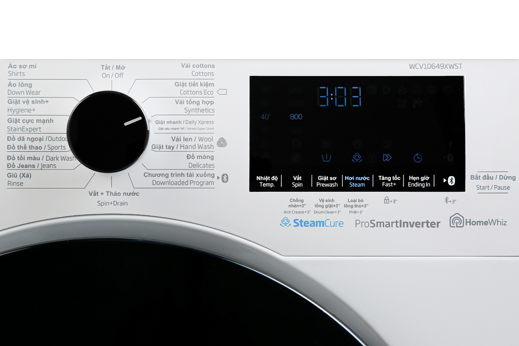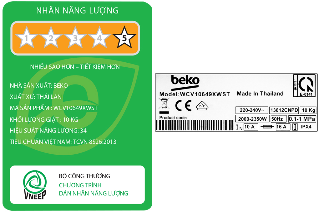 Loại máy giặt: Cửa trước Lồng giặt: Lồng ngang Khối lượng giặt: 10 Kg Số người sử dụng: Từ 5 - 7 người (9.5 - 10 kg) Kiểu động cơ: Truyền động gián tiếp (dây Curoa) Công nghệ giặt: Cảm biến thông minh Optisense Tính năng hơi nước SteamCure Aquawave Tech bảo vệ sợi vải Silent Tech giặt yên tĩnh Công nghệ sấy: Đang cập nhật Tiện ích: Kết nối thông minh HomeWhiz Đèn chiếu sáng lồng giặt Khóa trẻ em Tự khởi động lại khi có điện Vệ sinh lồng giặt Hẹn giờ giặt Hiệu suất sử dụng điện: 34.0 Wh/kg Tốc độ quay vắt tối đa: 1200 vòng/phút Chất liệu lồng giặt: Thép không gỉ Chất liệu vỏ máy: Kim loại sơn tĩnh điện Chất liệu nắp máy: Nhựa Bảng điều khiển: Tiếng Việt nút nhấn Sản xuất tại: Thái Lan Thời gian bảo hành động cơ: 12 năm Dòng sản phẩm: 2019 Hãng: Beko   Giảm tác nhân dị ứng, giặt sạch vết bẩn cứng đầu và giảm nhăn quần áo với tính năng giặt hơi nước SteamCure Máy giặt Beko Inverter 8 kg WCV10649XWST tích hợp tính năng giặt hơi nước SteamCure sẽ giúp loại bỏ tốt các loại vi khuẩn, tác nhân gây dị ứng bám trên da (được chứng nhận bởi Hiệp hội Dị ứng Anh Quốc), cũng như hạn chế được tình trạng xoắn rối và nếp nhăn của quần áo sau khi giặt. Ngoài ra, tính năng này còn giúp làm mềm vết bẩn trước khi giặt nước, từ đó dễ dàng lấy đi các vết bẩn cứng đầu, cho hiệu quả giặt tốt hơn. Đây là một tính năng đặc biệt được Beko đưa vào sản phẩm mới của mình, đáp ứng được nhu cầu giặt giũ ngày càng tiện lợi và bảo vệ sức khỏe hơn.   Hiệu quả giặt vượt trội, kiểm soát năng lượng tối ưu cùng cảm biến Optisense - 4 cảm biến Máy giặt được hãng trang bị 4 cảm biến Optisense, giúp kiểm soát năng lượng tối ưu và hiệu quả giặt sạch vượt trội: