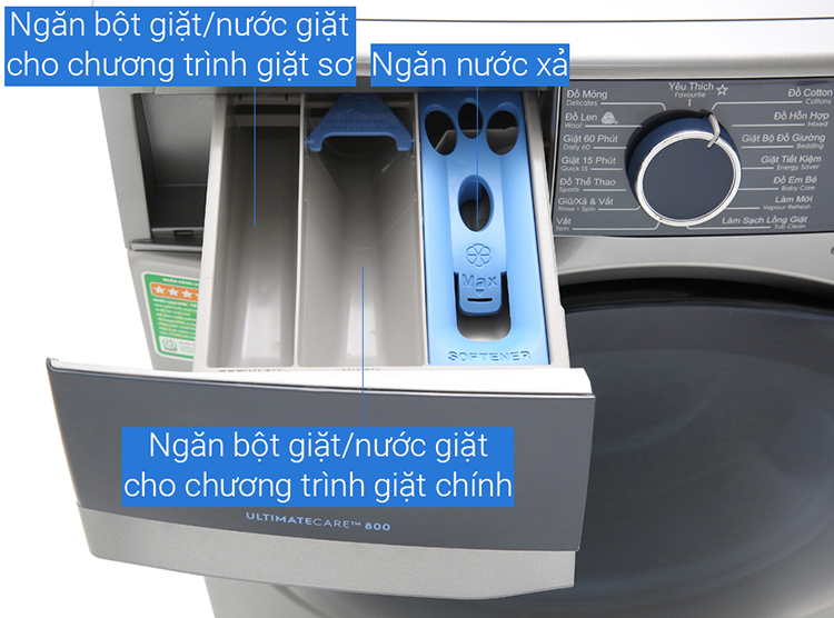 • Máy giặt cửa trước hiện đại lồng ngang • 15 chương trình giặt tự động tích hợp (ECO 40-60, Cotton, Cotton prewash, Cotton 20°C, Colours, Synthetics, Wool, Duvet, Rinse, Allergy Safe, Spin/Drain, Hand wash/Delicate,