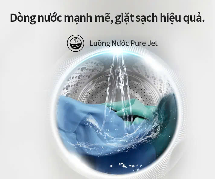 - Hệ thống Pure Jet tạo ra dòng nước mạnh mẽ, rửa sạch bột giặt và cặn bẩn còn bám lại trên cửa, giúp quần áo được giặt sạch hơn.