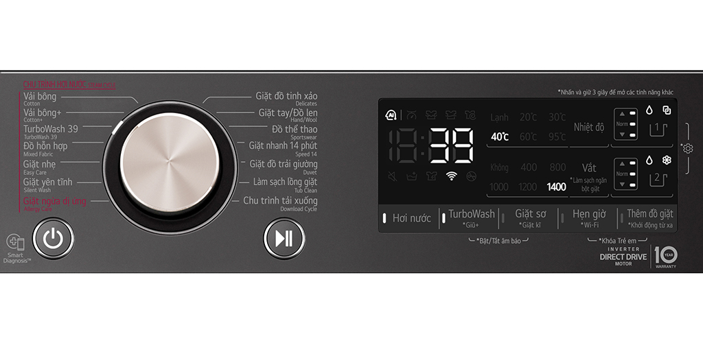 - Tích hợp sẵn 14 chương trình hoạt động đa dạng, tiện lợi cho người sử dụng như: giặt nhanh 14 phút, giặt ngừa dị ứng, giặt nhẹ, giặt tay + đồ len, giặt vải bông +, giặt đồ hỗn hợp, giặt vải bông, đồ tinh xảo, giặt chăn ga, đồ thể thao, giặt yên tĩnh, giặt TurboWash 39 phút, vệ sinh lồng giặt và chu trình tải về. Công nghệ giặt đặc biệt - Công nghệ AI DD: Sử dụng động cơ truyền động trực tiếp DD kết hợp với trí tuệ nhân tạo để nhận biết được chất liệu vải cùng khối lượng quần áo, để tự động chọn chương trình phù hợp, từ đó tối ưu hóa chương trình và đảm bảo hiệu quả giặt sạch quần áo. - Công nghệ TurboWash360: Sử dụng đến 4 vòi phun đa chiều 3D tạo ra áp lực nước cao để hỗ trợ hòa tan bột giặt và tăng tốc độ thẩm thấu chất giặt tẩy vào sâu bên trong sợi vải để loại bỏ vết bẩn hiệu quả, đồng thời đảm bảo chu trình giặt diễn ra nhanh chóng, tiết kiệm thời gian giặt giũ. *Video chỉ mang tính chất minh họa Động cơ - Công nghệ tiết kiệm điện